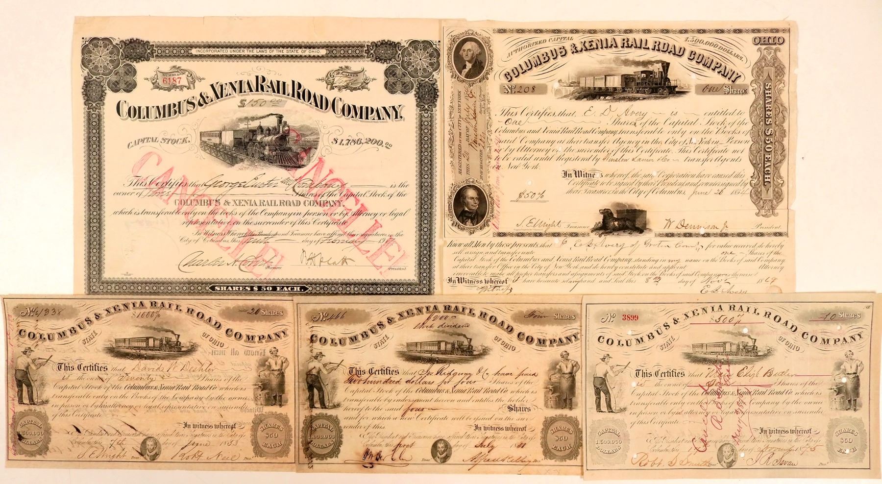 Group of 5 includes: Three common stock certificates, issued in 1851, 1853 and 1875. Shares were $50 Each. Passenger train with four cars, l-r. Cut cxls. on the 1851 and 1853 stocks. 1875 shares have hole and pen cancels. Fourth common share certificate is dated 1854. Slightly larger certificate with transfer stub at the bottom. George Washington at top left. Dog and safe at the bottom. Hole cxls. Last certificate is issued for 3 shares in 1917. Train on trestle l-r. Stamp cxled. Tear in top border scotch tape repaired.