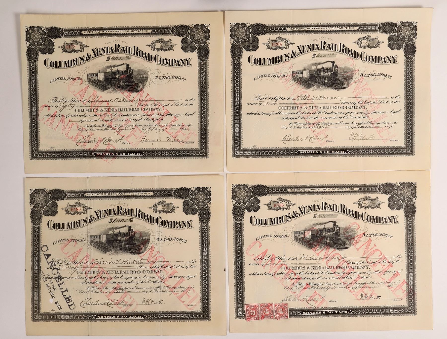 Lot of 4 stocks, issued 1915-1917. All have the same design: black border and print and locomotive vignette. Inc. in Ohio. Signed by president Platt (x3) and one by vice president Taylor. All have adhesive revenue stamps attached to either front or back. Line opened in 1850. Connected Columbus and Xenia, Ohio. It was succeeded by the Little Miami Railroad. Columbus Ohio