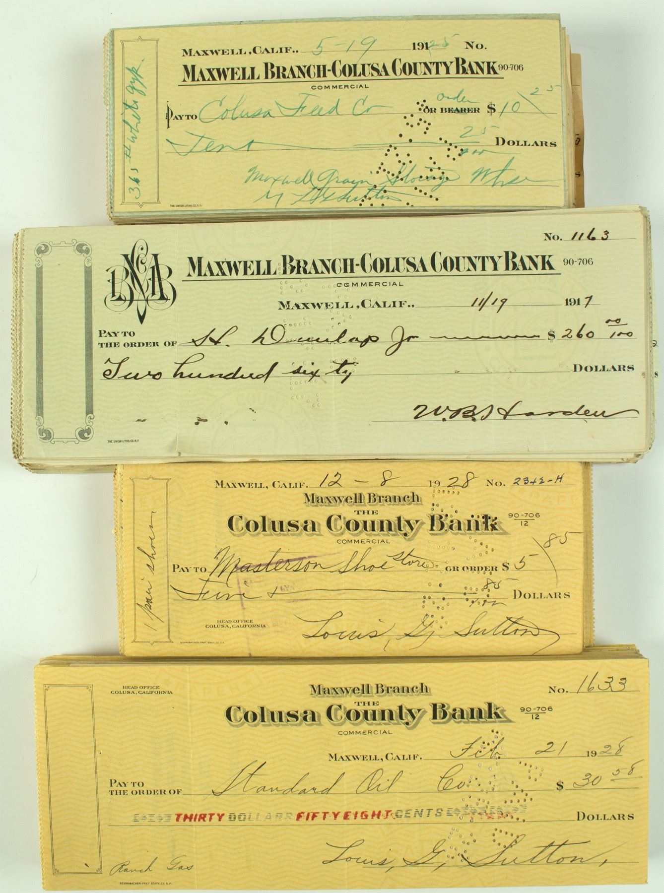Over sixty checks from the Maxwell Branch- Colusa County Bank from the early 20th century. State: California City: Maxwell HWAC#: 48247 Date: