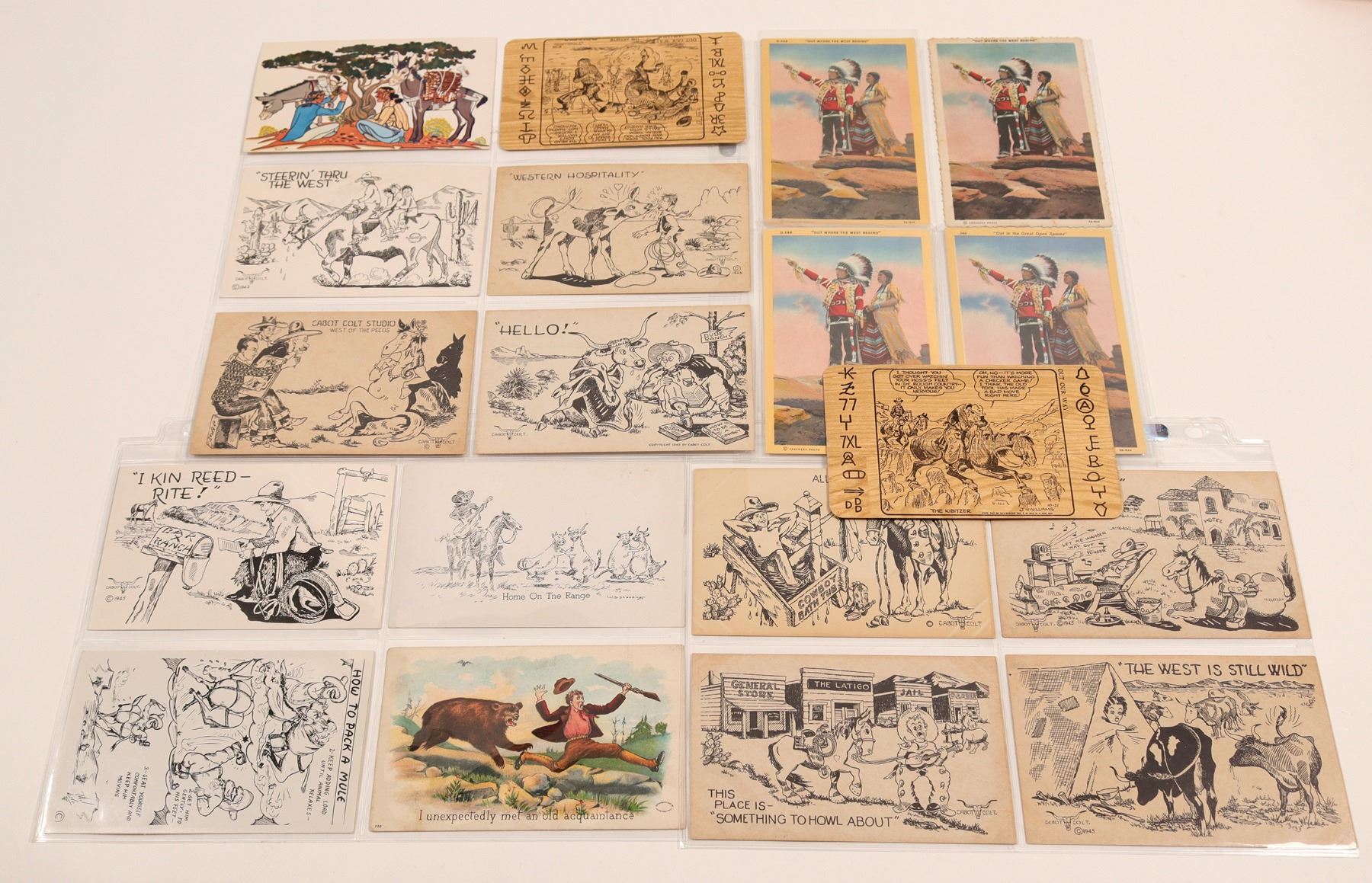 15 cards and 3 duplicates (6 color / 9 b/w) of Arthur Chapman's (1873-1935) "Out Where The West Begins" / "Out in The Great Open Spaces." Chapman was a 20th Century American poet, newspaper columnist and author. He wrote cowboy poetry with most famous being "Out Where the West Begins" which was 1st published in 1917 book.