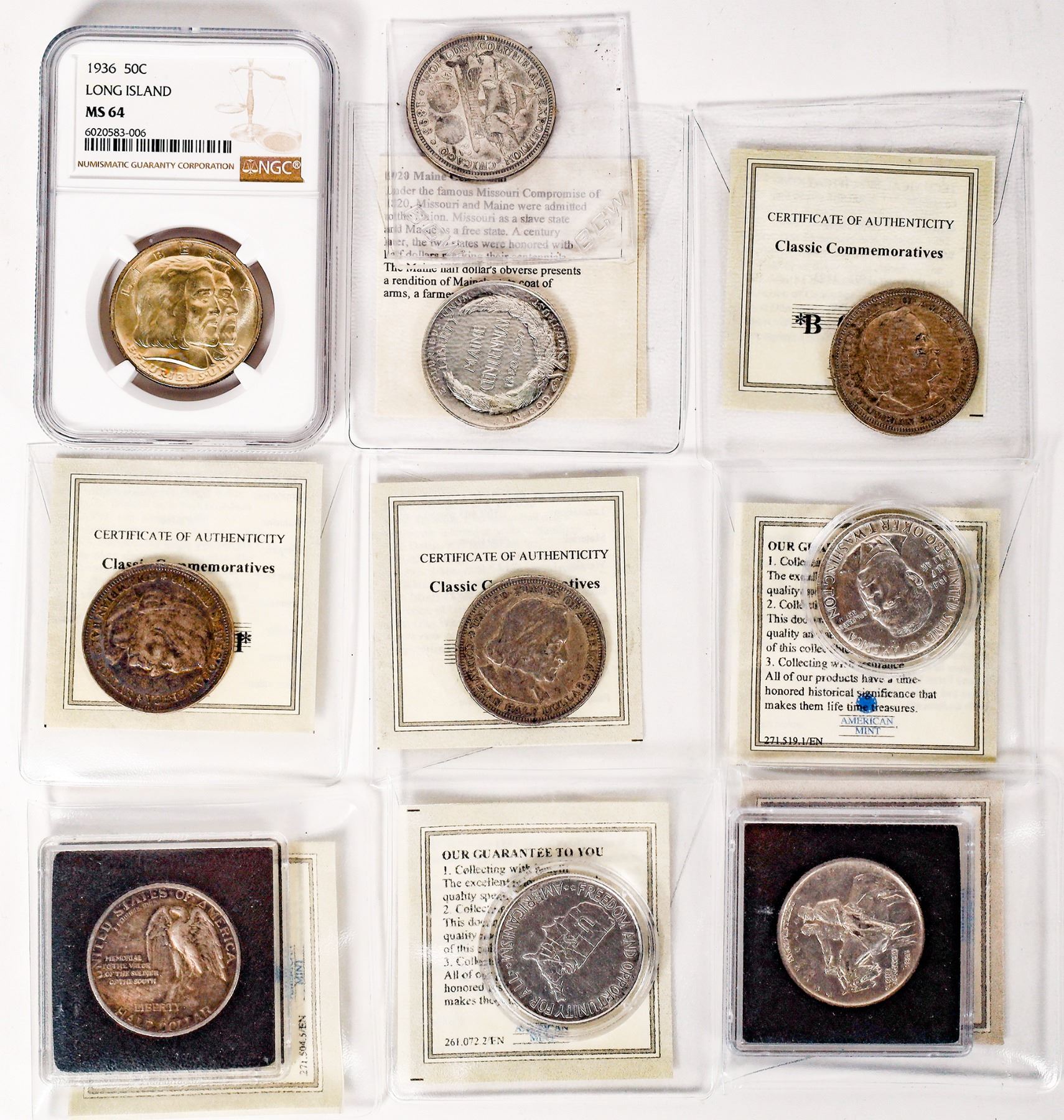 Lot of ten: 1) 1936 Long Island, graded MS 64 by NGC; 2) 1952 Washington Carver, AU; 3) 1946 Booker Washington, EF-AU; 4) 1925 Stone Mountain, F-EF; 5) 1925 Stone Mountain, EF; 6) 1893 Columbian Exposition, F-EF; 7) 1893 Columbian Exposition, F-EF; 8) 1893 Columbian Exposition, F-EF; 9) 1893 Columbian Exposition, F-EF; 10) 1920 Maine Centennial, VF-EF.