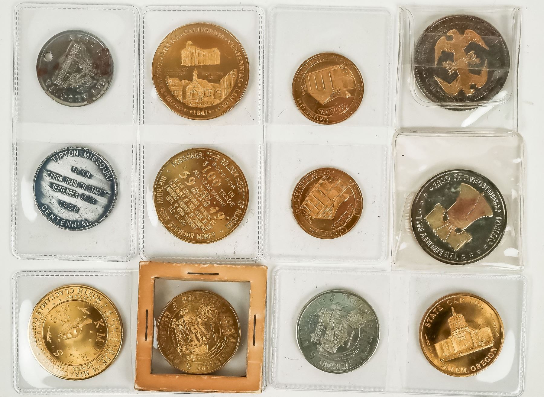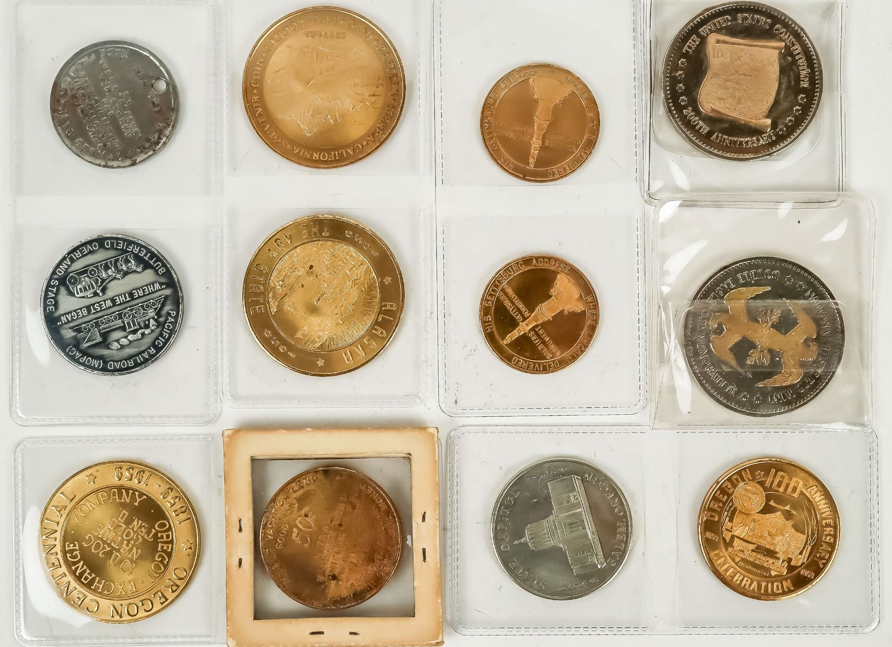 Miscellaneous lot of twelve commemorative medals: 1959 Oregon Centennial (4): Salem (2); Newport; North Clackamas County. Gettysburg National Museum (2); 1958 Tipton Missouri Centennial; Victory Liberty Loan; Liberty Bell; 200th Anniversary of the Constitution; 1959 Alaska the 49th State; Mono/Inyo County Centennial.