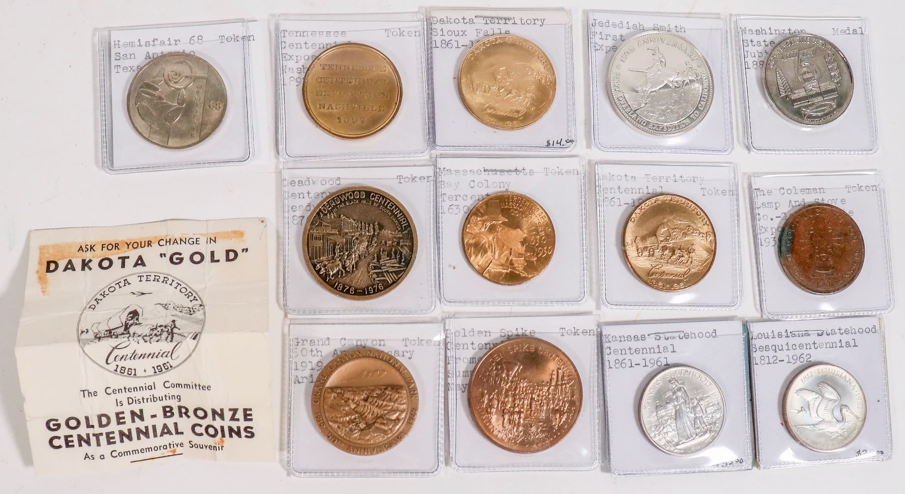Lot of 13 medals: 1961 Dakota Territory Centennial (2); 1976 Deadwood Centennial; 1962 Louisiana Statehood Sesquicentennial (silver?); 1997 Tennessee Centennial Exposition Nashville; 1930 Massachusetts Bay Colony Tercentennial; 1969 Grand Canyon 50th Anniversary; 1969 Golden Spike Centennial; 1964 Washington State Diamond Jubilee; 1968 Hemisfair San Antonio; 1939 Coleman Lamp and Stove Golden Gate Expo; 1961 Kansas Statehood Centennial (.925 silver); Jedediah Smith 150th Anniversary First Overland Expedition to California (.925 silver).