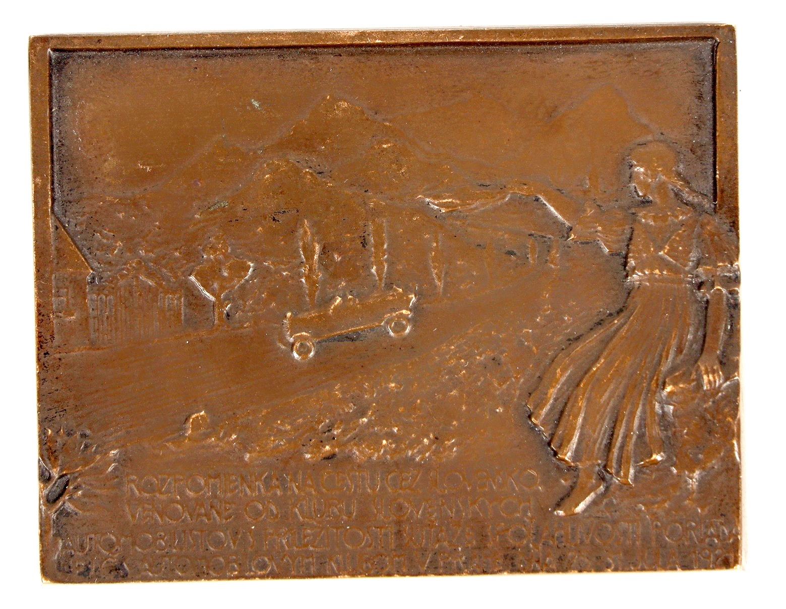 Bronze plaque 65 x 50 mm, with text "Rozpomienka Na Cestu Cez Slovensko," which translates to "Remembrance of the Journey Through Slovakia." The plaquette features a low-relief sculpture, a common form of artistic expression during the Italian Renaissance and later periods. Dated July 1921.