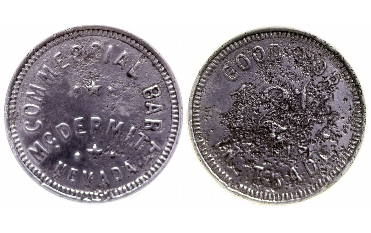 Obv.: Commercial Bar / McDermitt / Nevada; rev.: Good For / 12 1/2 / Cents / In Trade; Al, 24mm, NCS genuine.