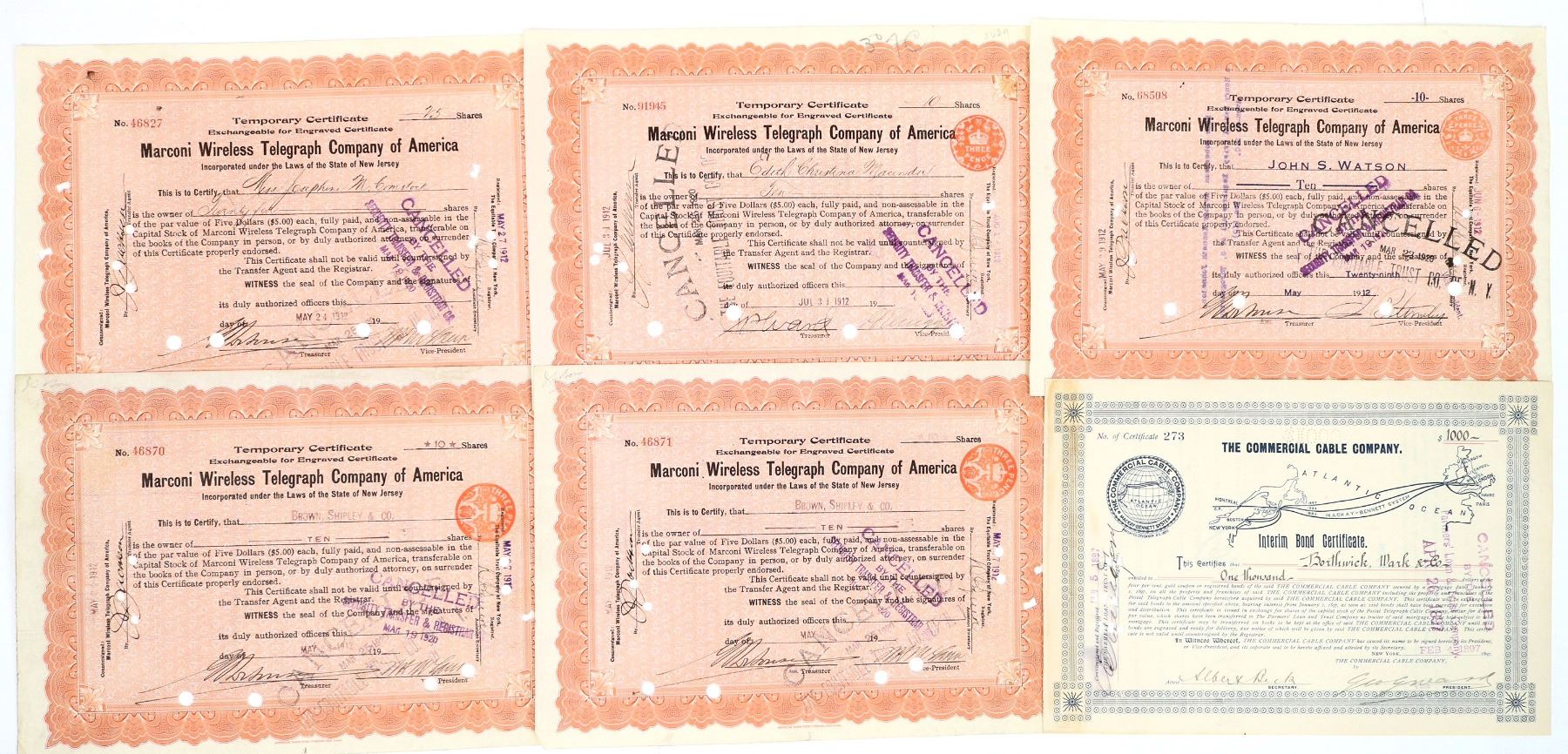 All issued. 1x 1897 The Commercial Cable Company with trans Atlantic map vignette. 5x 1912 Marconi Wireless Telegraph Co. of America.