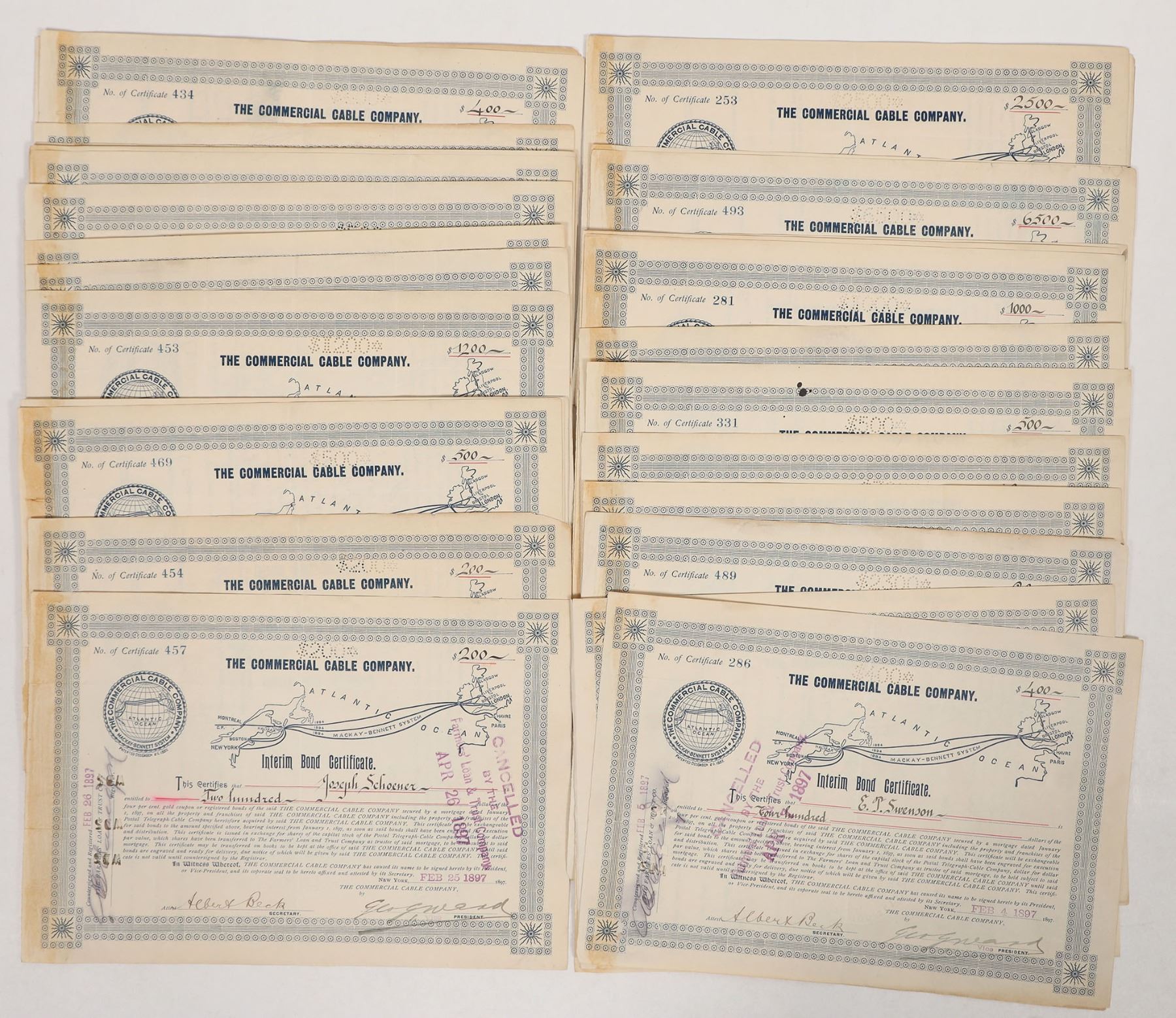 About 45 issued 1897 Commercial Cable Co. stocks with 2 global ocean line pictorials.
