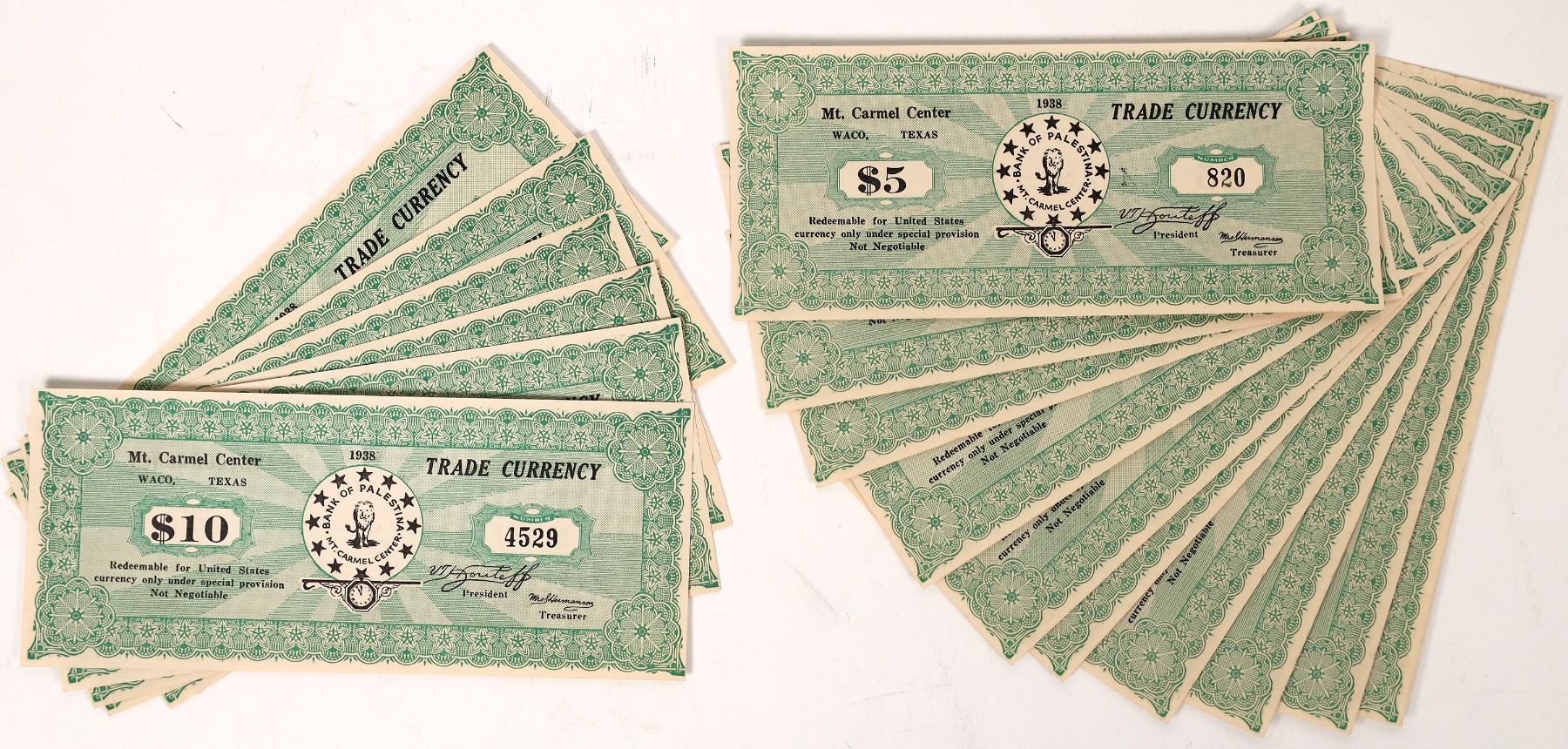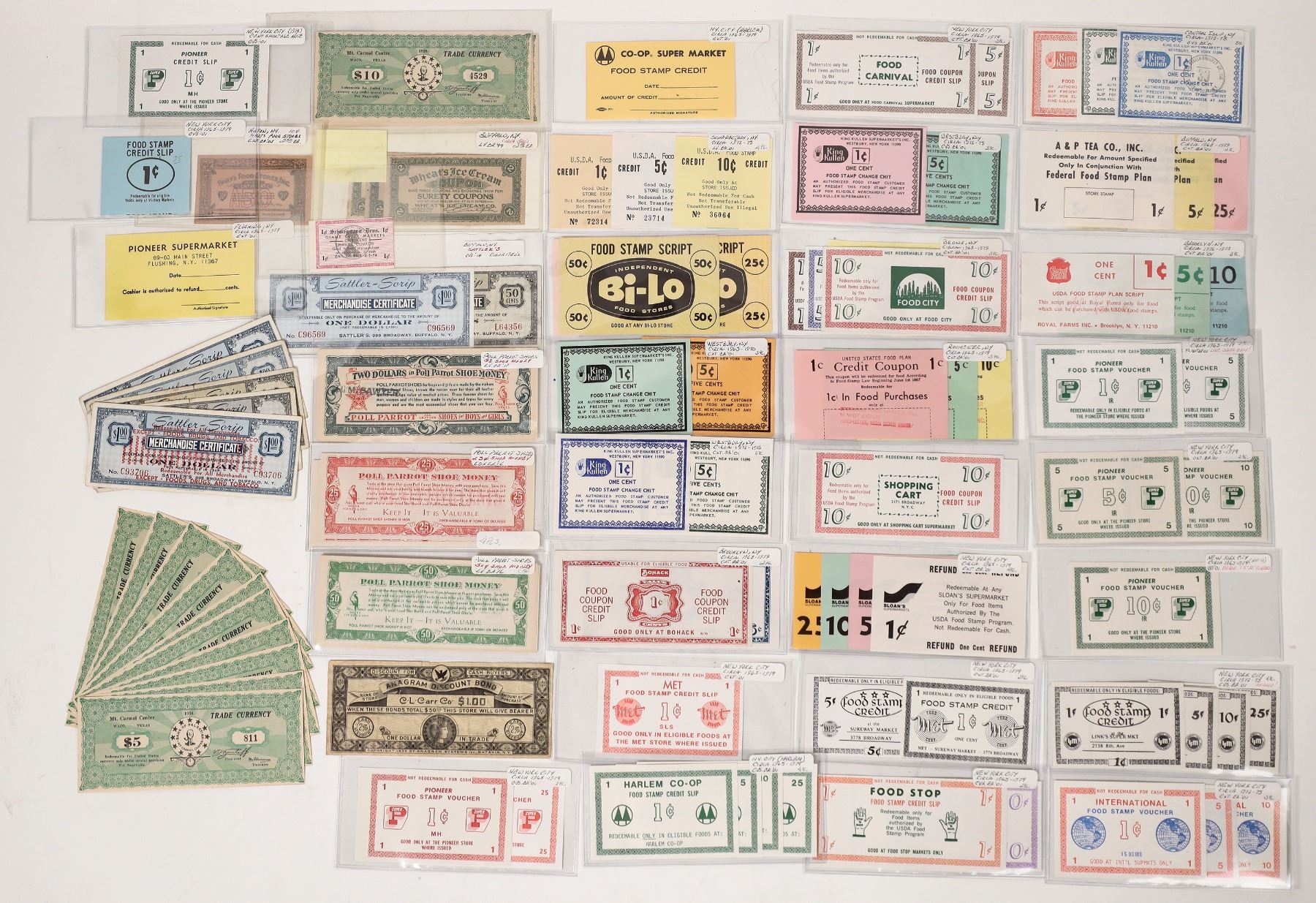 Large variety of commercial scrip from the 1930s-1970s. C. L. Carr, Batavia, New York, 1934; Poll Parrot Shoe Money; Sattler-Scrip, Buffalo, New York; Wheat's Ice Cream, Buffalo; Mt. Carmel Center, Waco, Texas; Food Stamp Credits from markets all over New York City. Over 100 pieces of scrip.