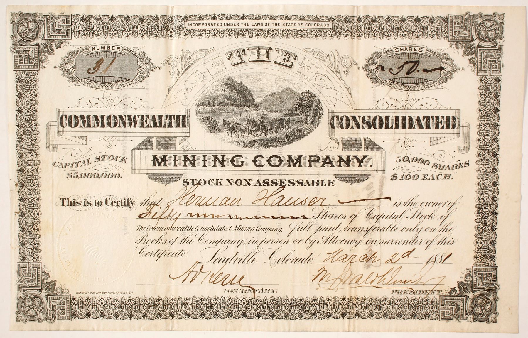 Leadville Mining District. # 31 for 50 shares to Herman Hauser.Signed by A Kerr and M J Watkins. Dateline Leadville 1881. Interesting horse drawn wagon vignette. There are mountains, trees and a mill in the background. Collier & Cleveland of Denver printer. Not cancelled. Light staining. Vertical folds. No edge or corner issues. Very nice. Ken Prag Collection