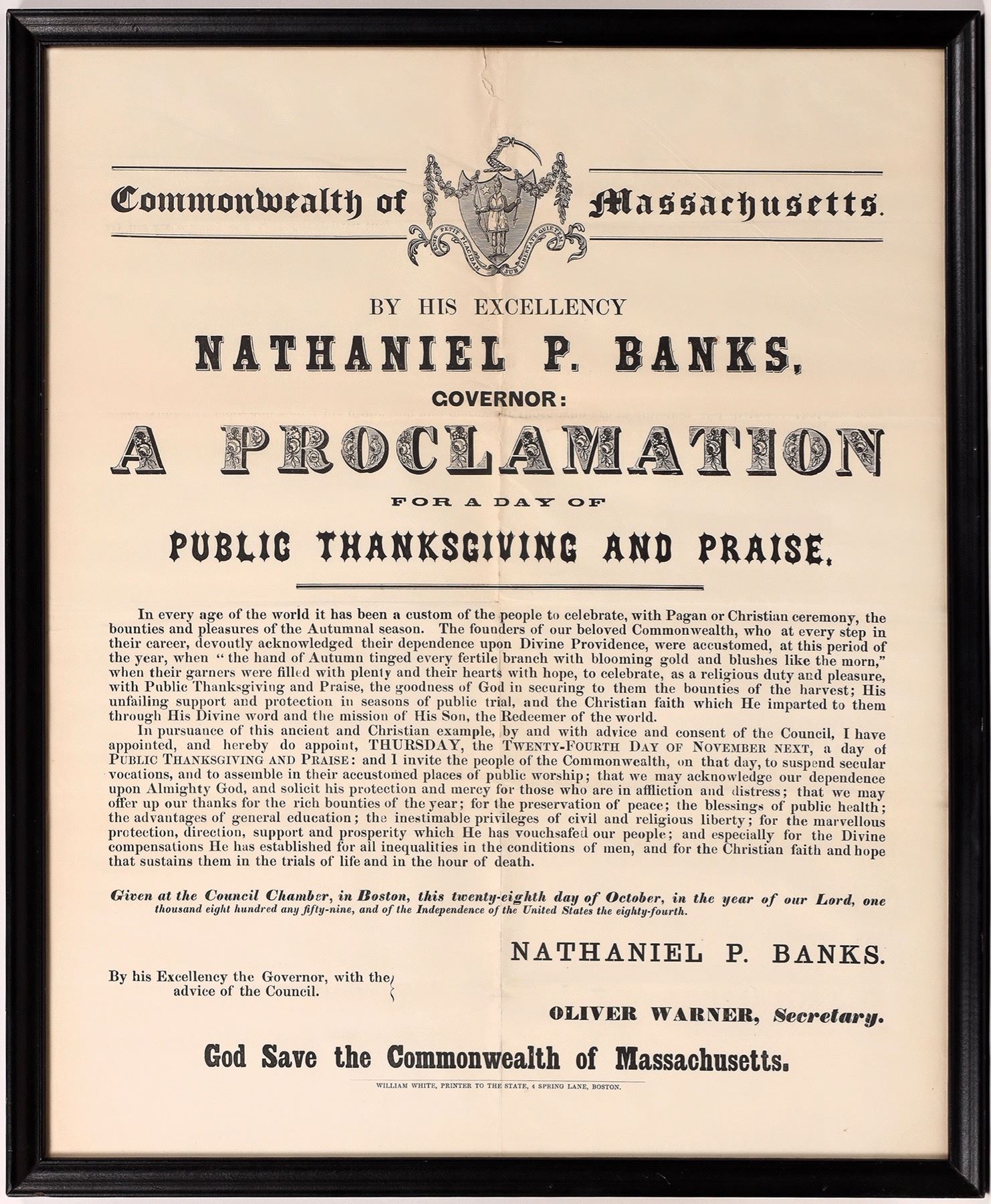 An original framed Proclamation from His Excellency the Governor of the Commonwealth of Massachusetts, Nathaniel P. Banks for a Day of Thanksgiving & Praise. Printed by William White, printer to the state, Boston. Dated October 28, 1859.President Abraham Lincoln set a precedent for "a day of Thanksgiving and Praise" in the fall of 1863 during the Civil War to a fractured union, drawing upon a tradition Pilgrims brought to this soil. Thanksgiving has evolved since to something more of a time to start thinking about your Christmas shopping & watching American Football. Frame measures 19 1/2" x 23 1/2."