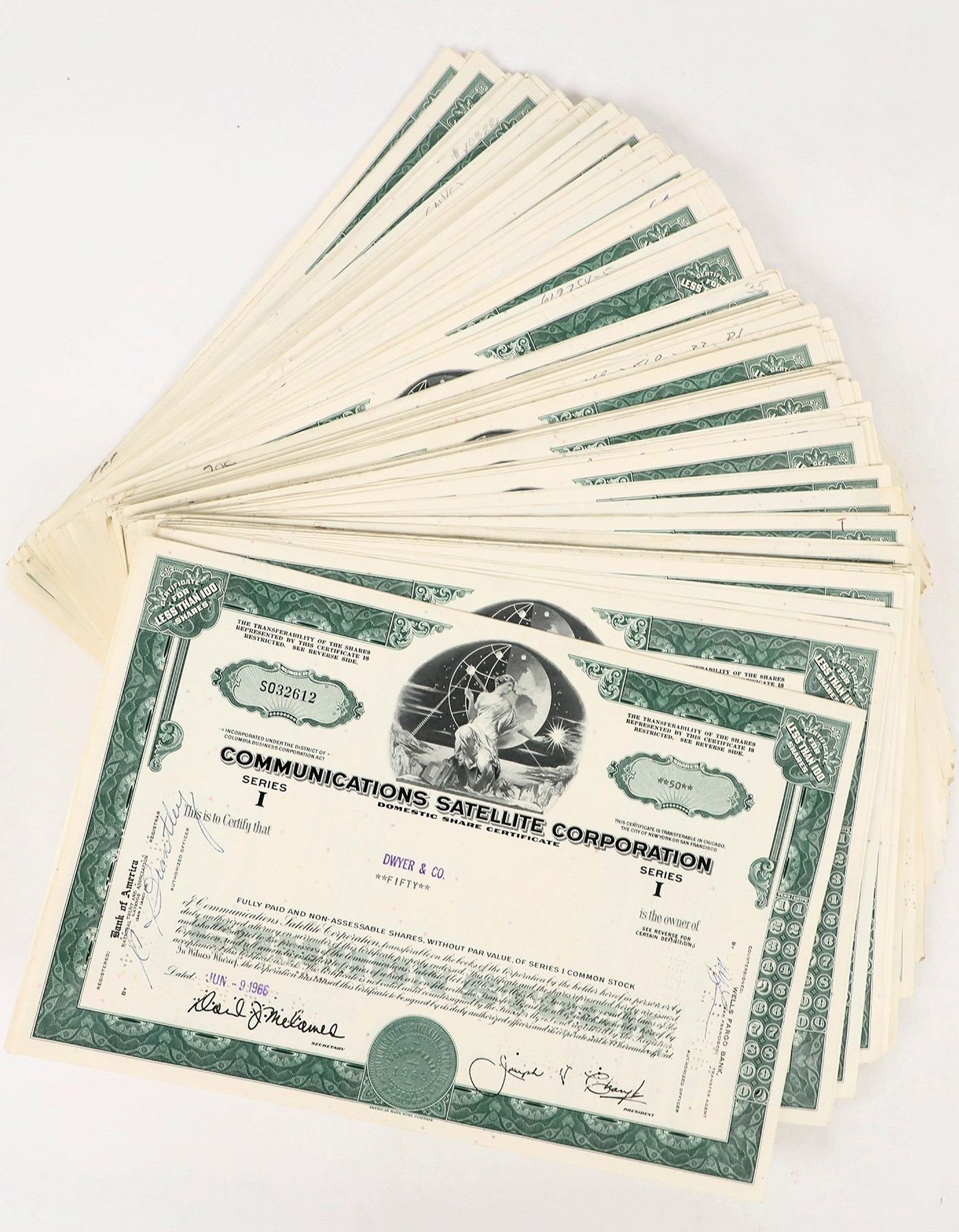 Group of approx. 260 stock certificates from the Communications Satellite Corporation, issued 1964 to 1966. All issued, all cancelled using hole punched and ink stamp cancellations. Great allegorical vignette. 12"x8" certs, all in good condition; see photos for detail.