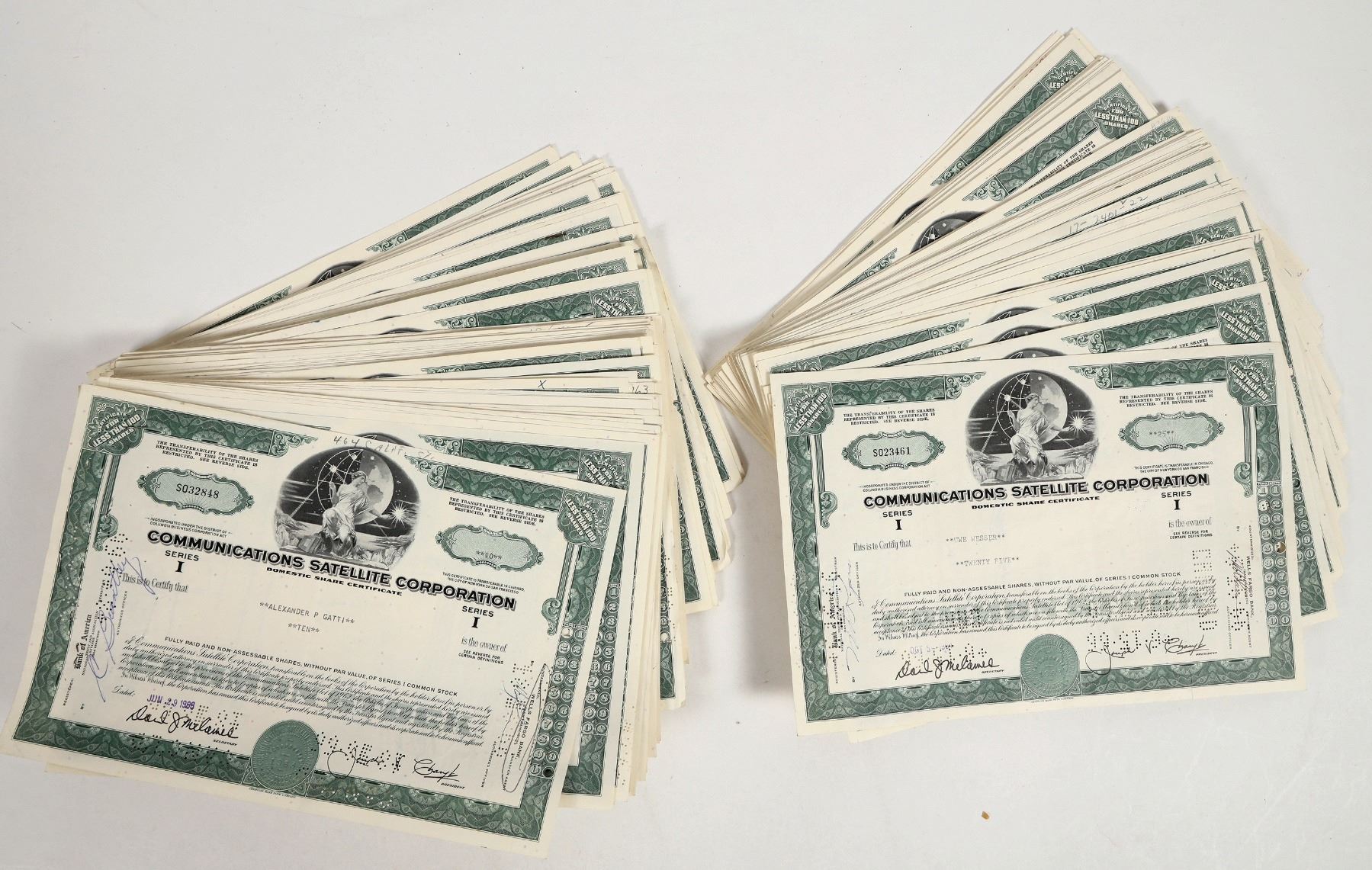 Group of approx. 240 stock certificates from the Communications Satellite Corporation, issued 1964 to 1966. All issued, all cancelled using hole punched and ink stamp cancellations. Great allegorical vignette. 12"x8" certs, all in good condition; see photos for detail.