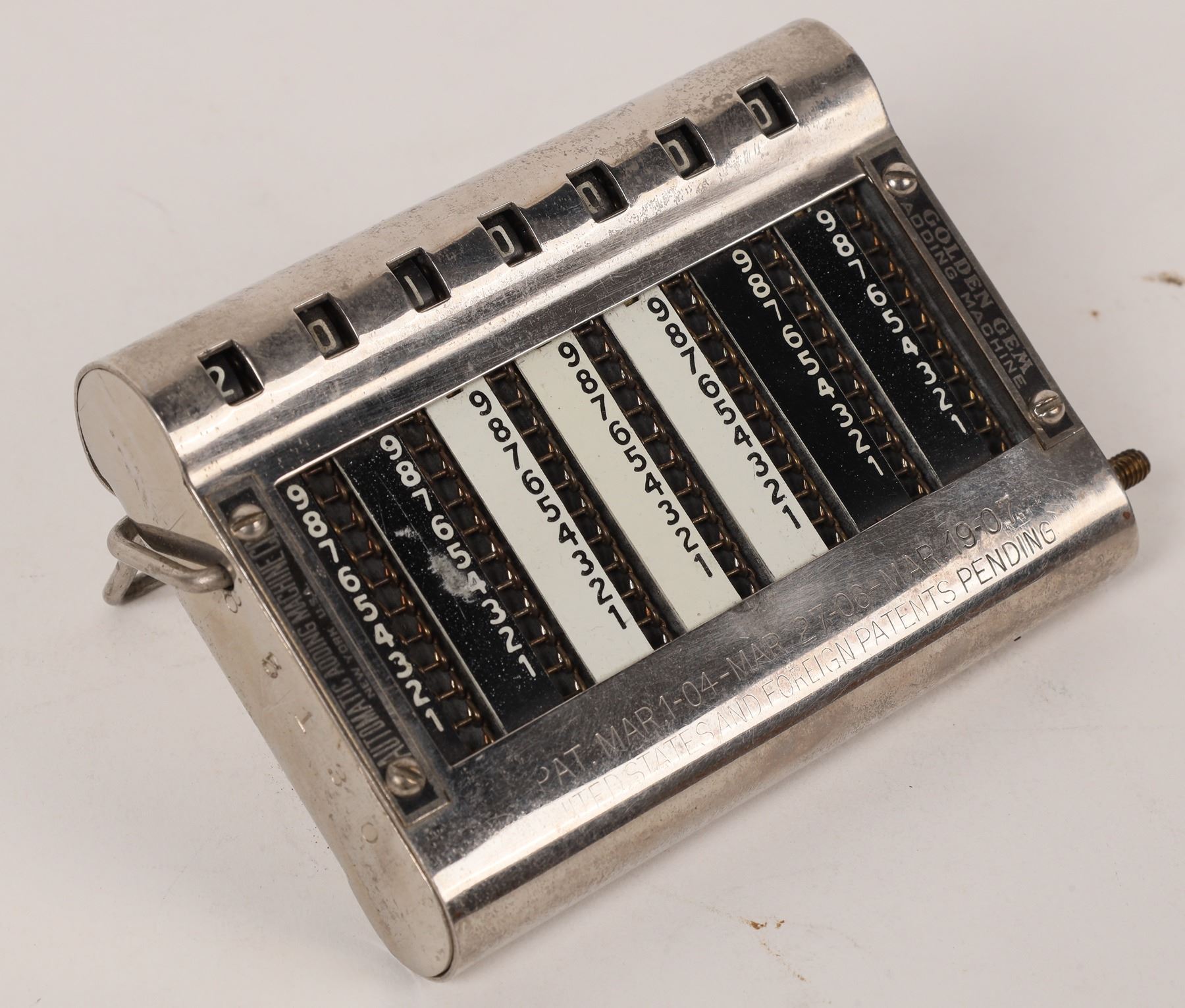 Rare nickel plated Automatic Adding Machine, NY, NY. Golden Gem model. 3x4", no rust. Lower right bare thread, is a part missing?