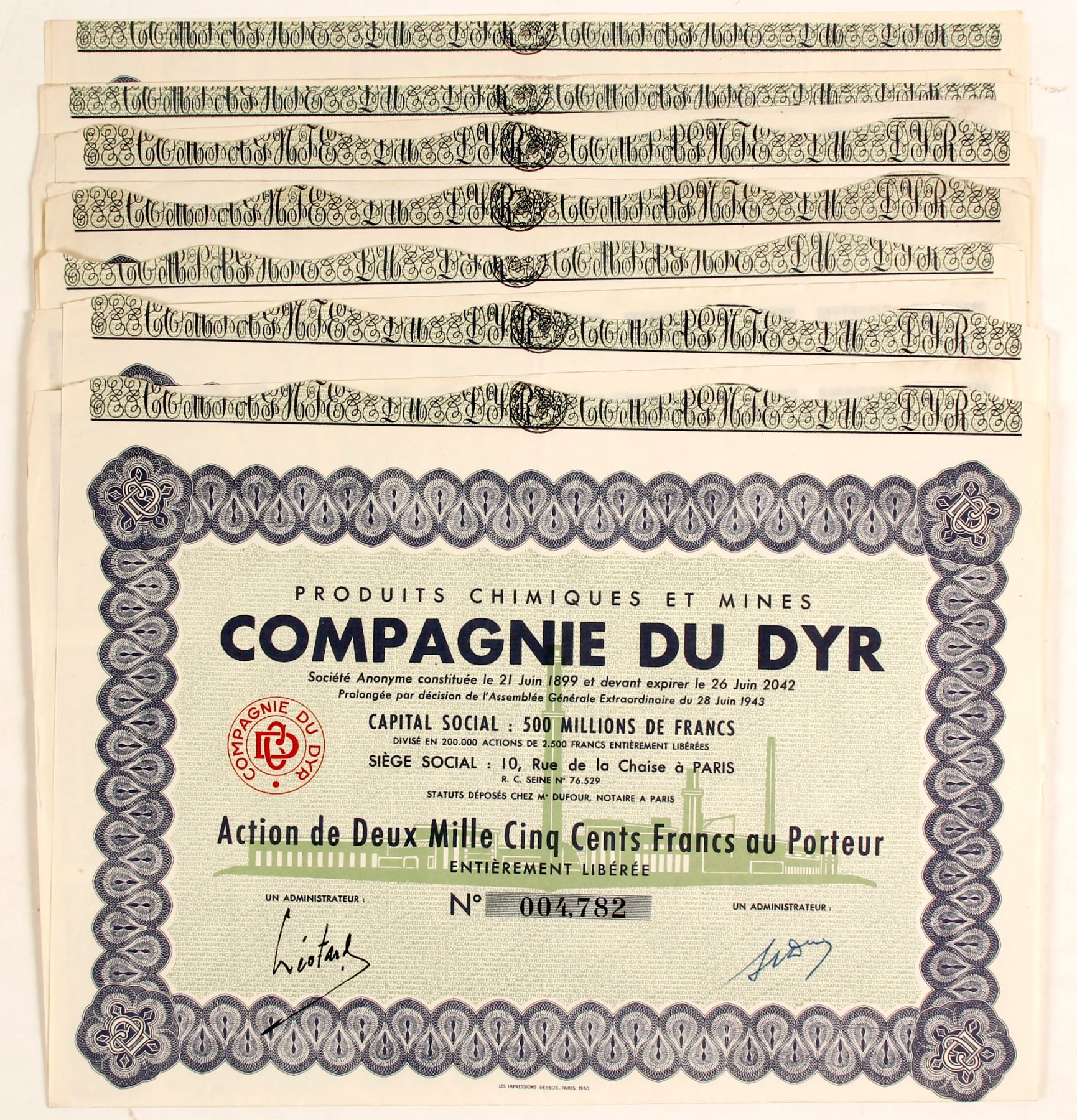 7 total certificates. All certificates are in French; all are signed and unissued, signatures illegible from two adminstrators; all in very good condition, revenue coupons are attached and in good condition; green and blue trim, with a vignette off a power plant in the background.