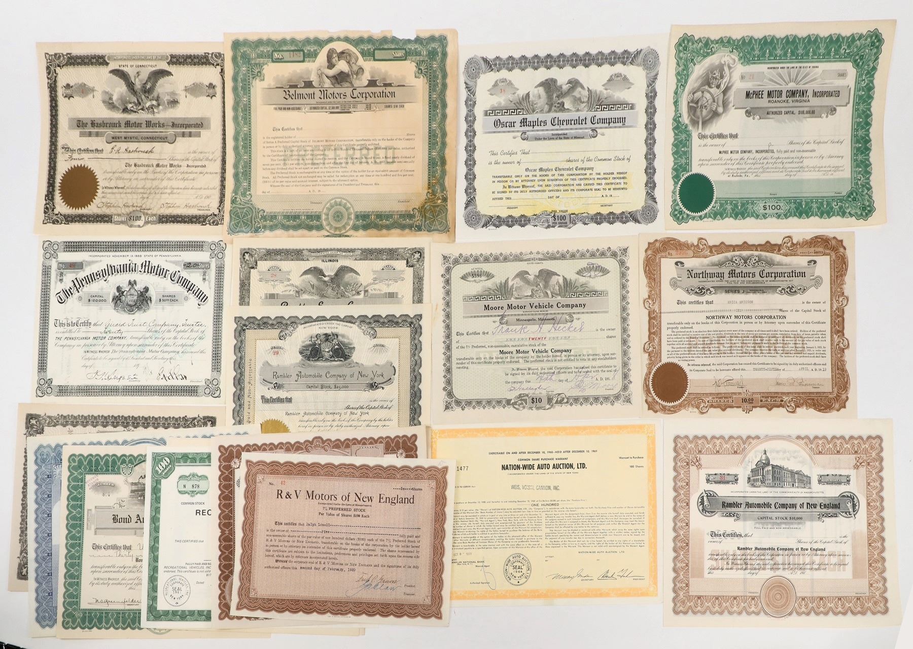Lot of 20, most different. Mix of issued and unissued. These are companies selling automobiles. Include: Belmont Motors Corp., Oscar Maple Chevrolet Co.; Moore Motor Vehicle Co. (1918); Northway Motors (1919); Nampa Automobile Co.; Rambler Automobile Co. of New York; and more. Please inspect.