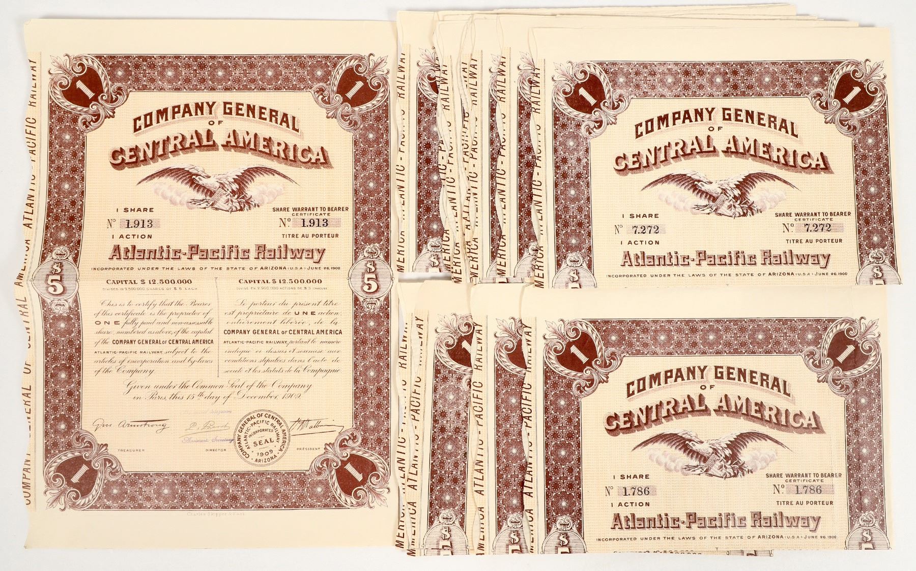 About 15 share/warrants in the Atlantic-Pacific Railway Company General of Central America. Eagle vignette.
