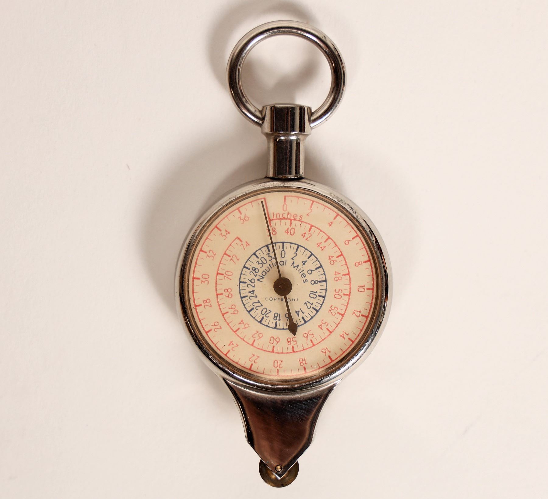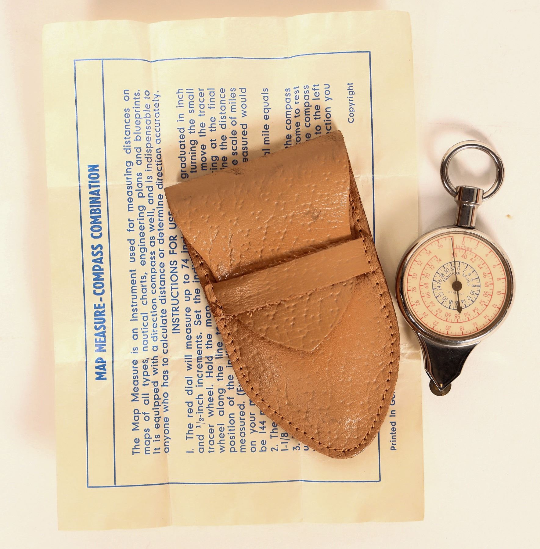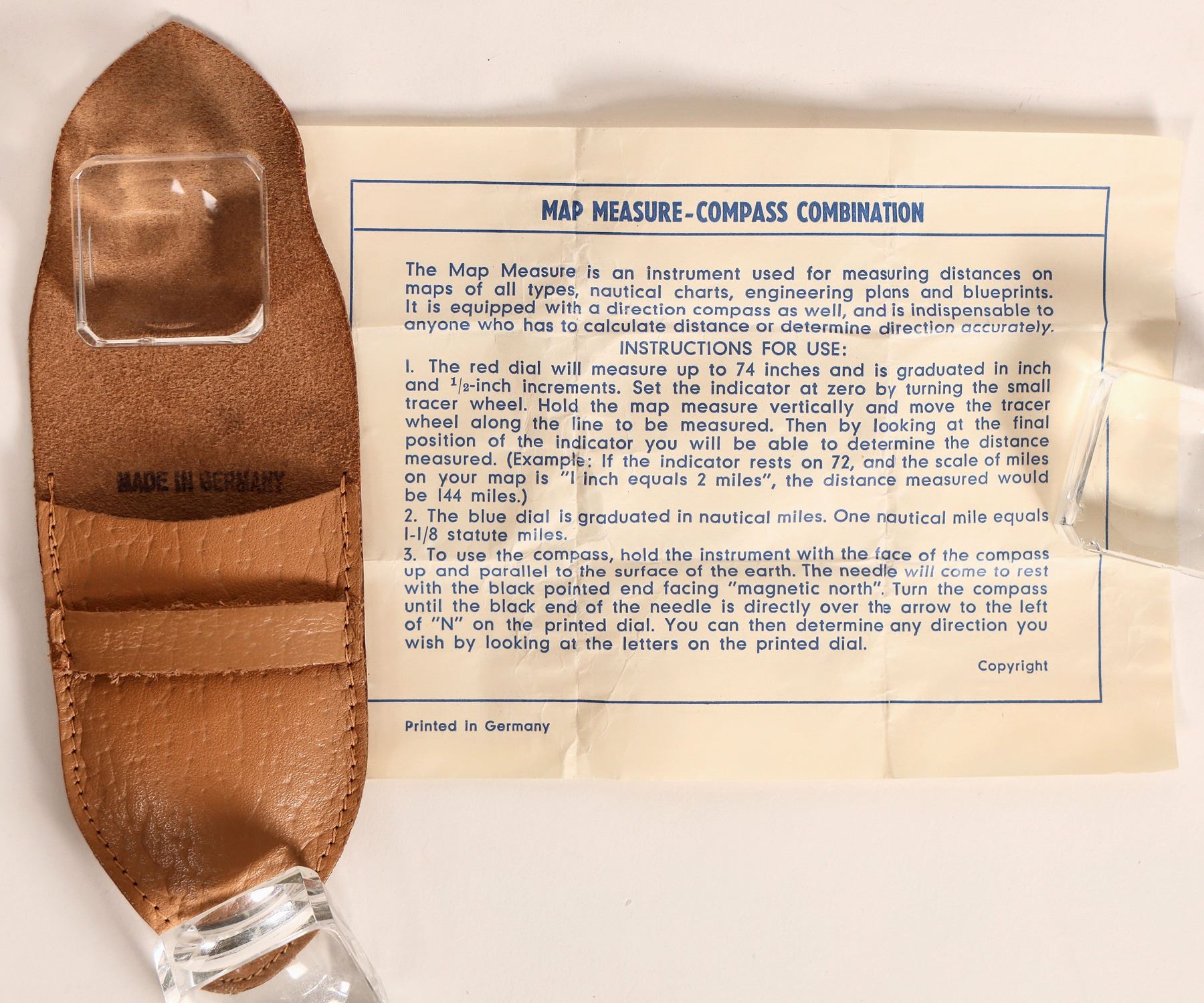 This unique compass is made in Germany with a compass on one face and the reverse face has a wheel drive to calculate distances from a map. C. 1930's. Cleverly designed with fast acting readings. The map reading is in land miles and nautical miles. 1. 375 in. face with carry case and instructions. Please see photo for details. Marked "made in Germany" without any prefix. c.1930's.