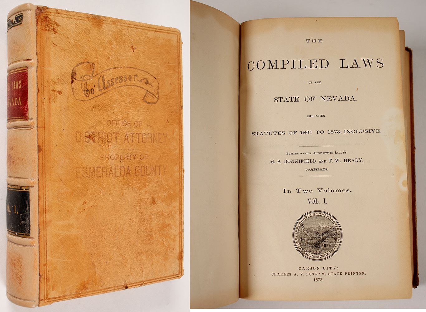 This is a professionally rebound copy of the first volume on Nevada laws. The front cover states "Co. Assessor / Office of District Attorney / Property of Esmeralda County." D. Thompson is stamped on the inside. In the brief time Thompson was the county assessor, he left his mark on this book forever! Thompson was appointed County Assessor on December 2, 1879. The office was declared vacant when he did not file a bond. On January 6, 1880 G. H. Hatch was appointed to this position. Nicely rebound and it would look good in any Nevada library. (Bennett Collection) Date: 1873 Location: Aurora, Nevada HWAC# 60211