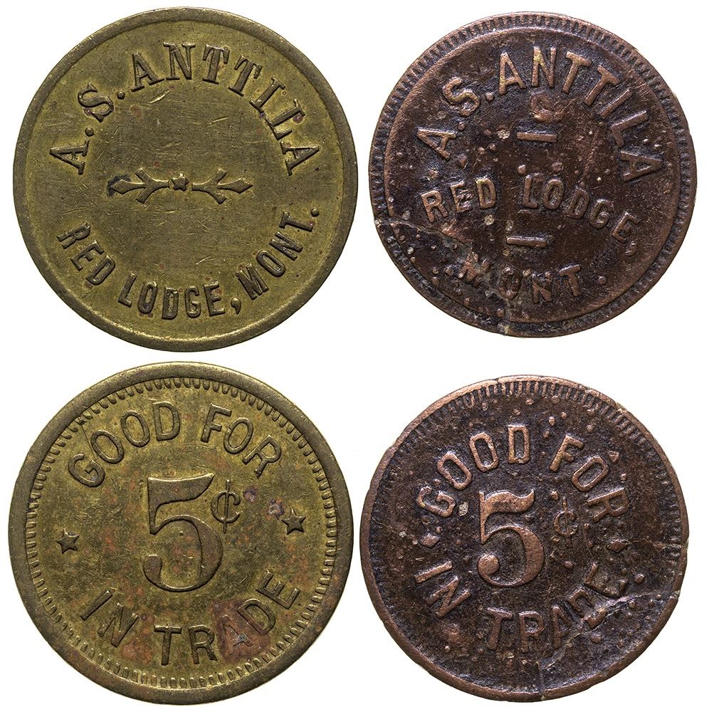 2 A.S. Anttila tokens from Red Lodge, Mont. that were ever issued. Both are R-7's and in fair to good condition. R-7 A.S. Anttila / Red Lodge, Mont. // GF / 5c / IT. Round, Brass, 29mm. R-7 A.S. Anttila / Red Lodge, / Mont. // GF / 5c / IT. Round, Copper 28mm. City: Red Lodge State: Montana, Date: Inventory# 40125