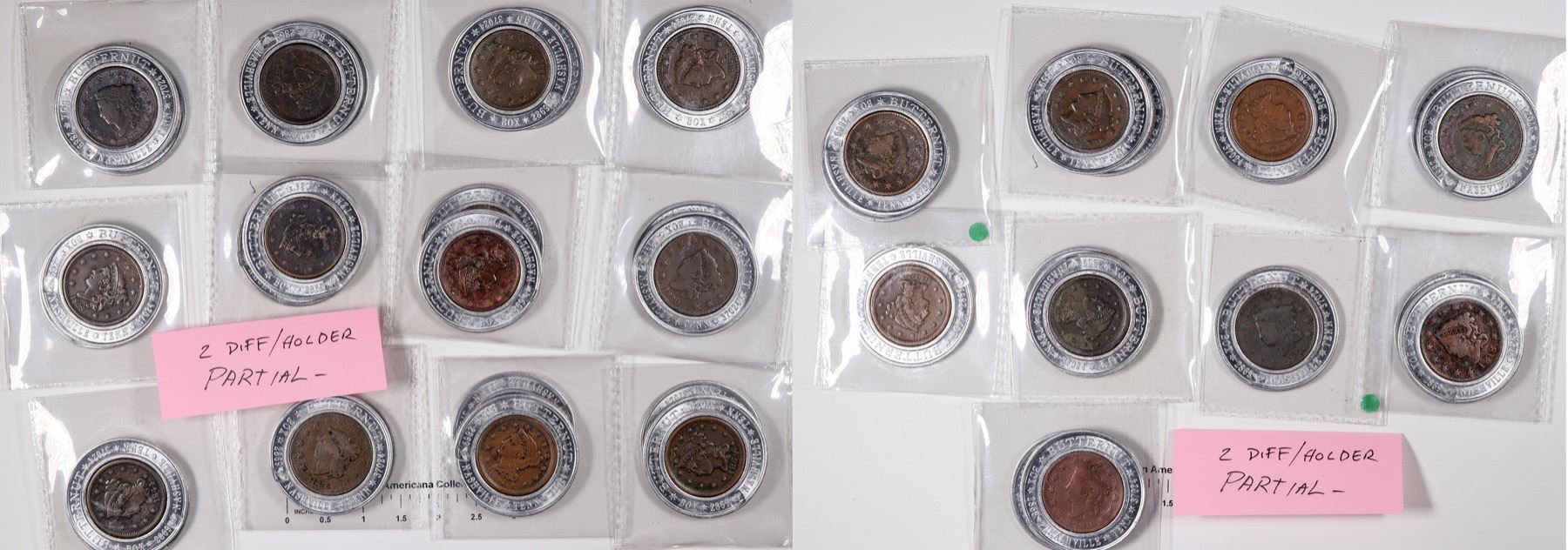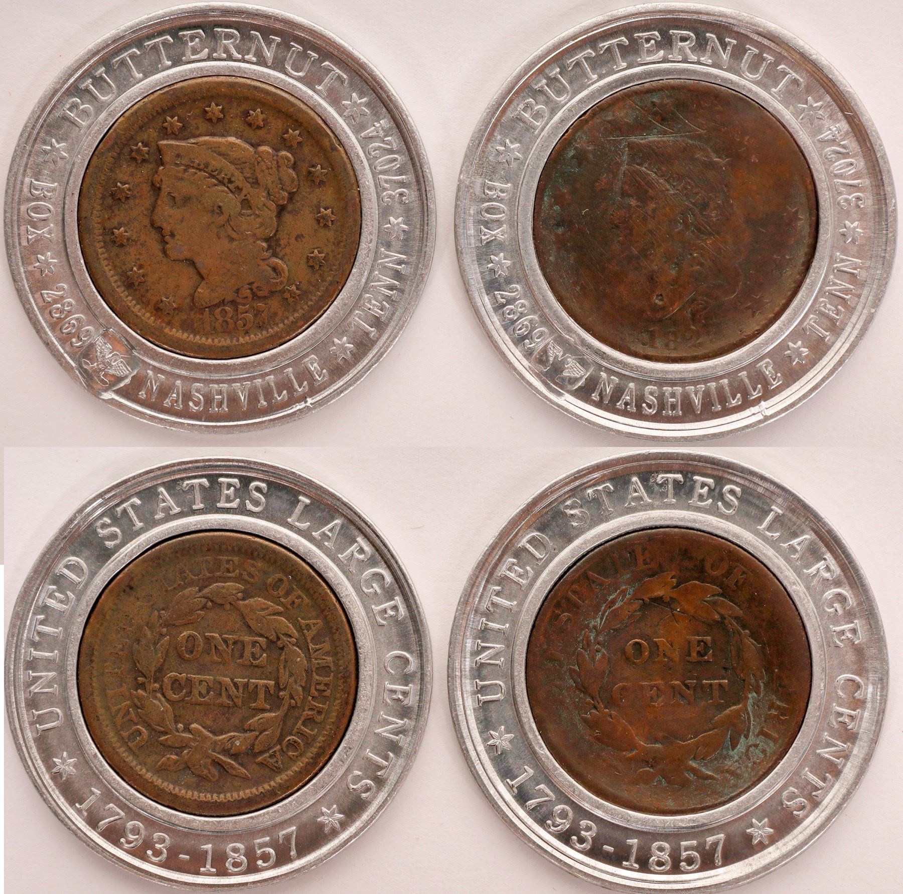 42 coins: Complete set of Encased "BUTTERNUT" Large Cents.1816-1857. Obv rim: Butternut / Box 2369 / Nashville / Tenn /37024; Rev.: United States Large Cents / 1793-1857. This is the only set known to exist, quite unique, and has the key dates, 1857, 1823, 1827. Grades very good to average. This is an important collection of encased cents, a very popular collecting area for numismatists. Here, expert Steve Ellsworth has put together a wonderful date set, the only one he made, that is nothing short of fantastic.
