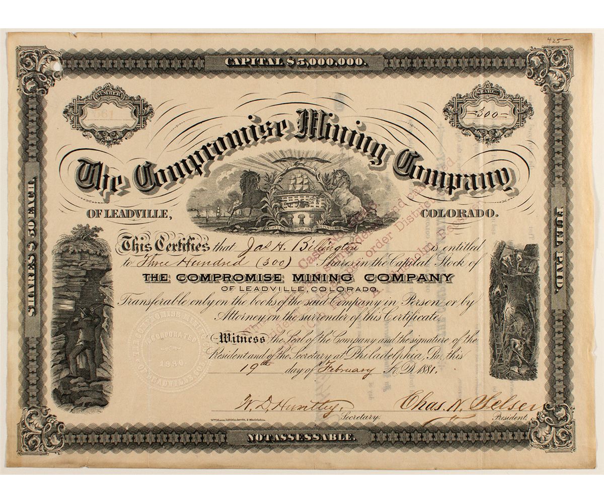 Rare. Incorporated under the laws of the State of Colorado, 1880. #561. Stamp cancelled. Issued for 300 shares to Jas. H Billington on Feb. 19th, 1881. Signed by Chas. W. Selser as president and W.D. Huntley as secretary. Rectangular vignettes of miners working on left and right. Central vignette of two horses with "Virtue, Liberty, and Independence" written beneath. Railroad bridge and sailboats on either side. Black ink on crème paper with fancy border and company seal bottom left. Reverse is endorsed by Billington. Printers: Wm. Mann, 529 Market St., Philadelphia. The company owned one claim, located in 1879 and patented in 1882, covering 3 ½ acres on Fryer Hill. It adjoined the Robert E. Lee mine, California District. Same officers as Dauntless Mining Co. [ref: Colorado Mining Directory, Corregan and Lingane, pg. 406] Condition: fold lines, a few small nicks and toning around the edges and one hole punched upper left. Measures 8 ½" x 11 ½"City: LeadvilleCounty: LakeState: CODate: