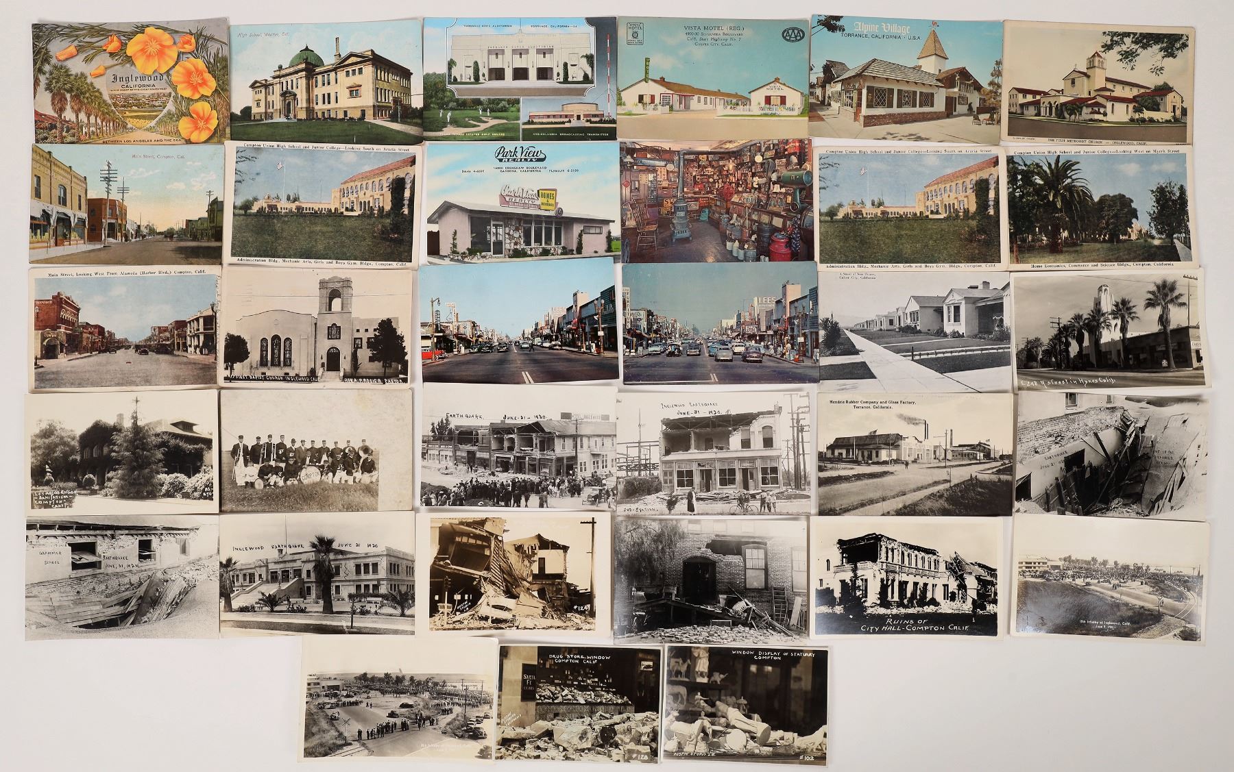 Lot of 32. Sixteen RPC's. Mostly borderless, some wht. borders. Post marks : Whittier Cal., Torrance, Compton, Inglewood. One has a 1 cent Mayflower stamp. . Earthquake scenes: Five depicting the damage from the 1920 Inglewood quake and five depicting the damage from the 1933 Compton quake. Two RPC's of the 15th Infantry gathered in Inglewood Cal. Street level view: schools, residential houses, churches, Torrance Civic Auditorium, Hendrie Co, churches, Compton Band, motelsAlpine Village, street scenes of Compton in diff era's : Main St., Compton Blvd California Compton 1909-39 Ken Prag Collection