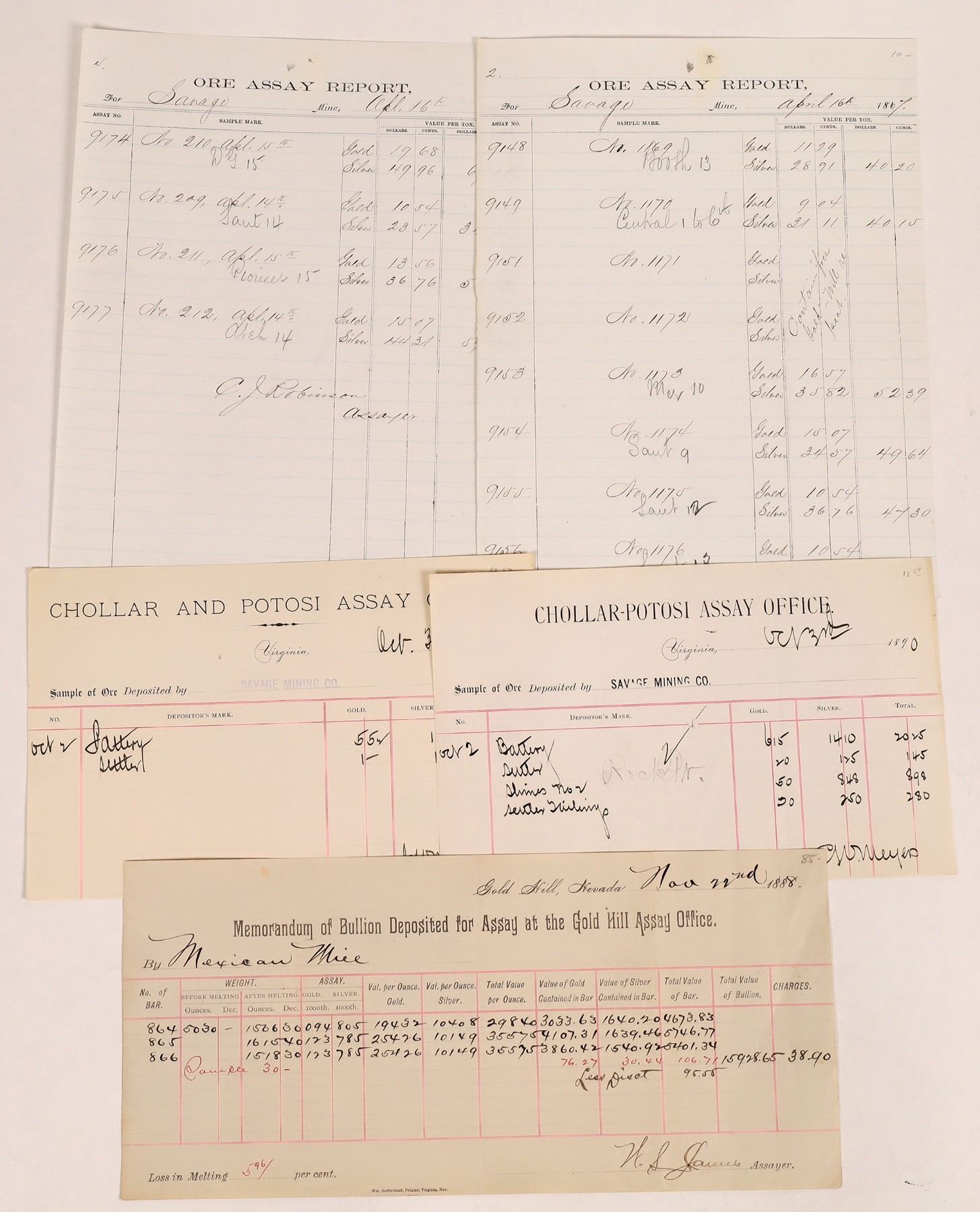 Lot of 5: 1) Memorandum of Bullion Deposited for Assay at the Gold Hill Assay Office, 1888, by the Mexican Mill. Three bars, total value near $16,000. Signed by assayer WS James; 2) Two different Chollar & Potosi Assay Office memorandums, Virginia City, 1890-1891, for deposits by the Savage Mining Company. Signed by CW Meyers; 3) Two Ore Assay Report sheets for the Savage Mine, 1867. List results from numerous mills. One signed by CJ Robinson, assayer.