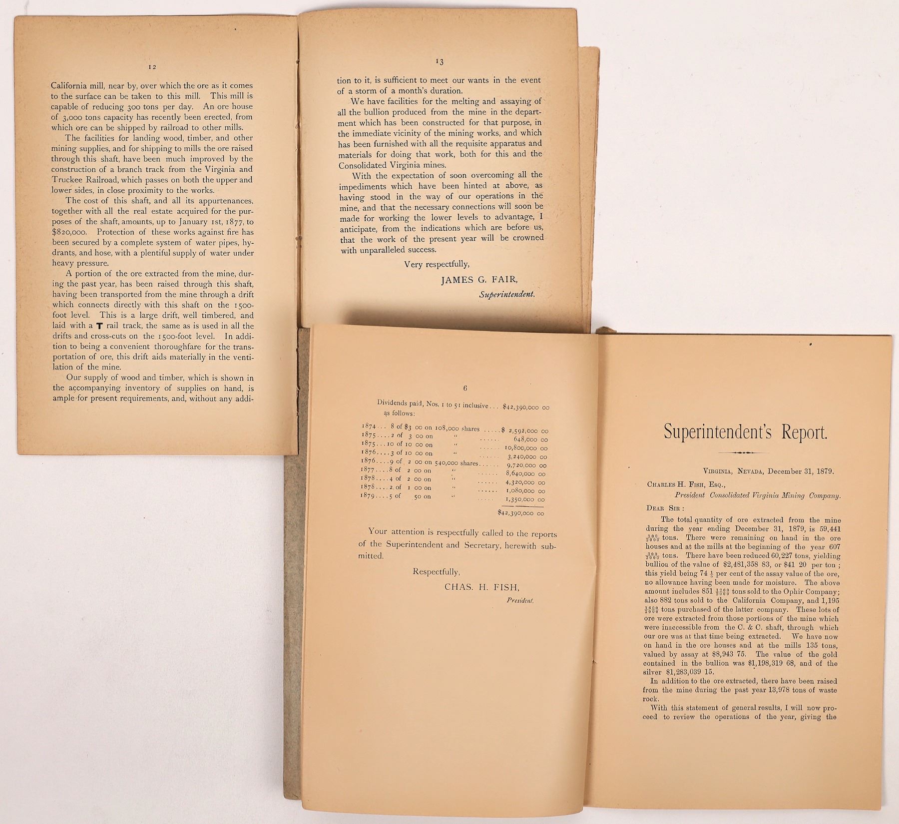 Lot of 2 different, both rare. The California and Con. Virginia were adjacent mines controlled by the Bonanza Firm and the site of the Big Bonanza discovery in 1873. 1) California Mining Company. 1877. Lists RH Follis as president, JC Flood as treasurer, James G. Fair as supt. and W.S. O'Brien as one of the trustees. (Mackay not listed). Includes report from Fair that details work at the 1300-1600 ft. levels. 17pp. Cover missing, last page loose. 8.25 x 5.25" Printed at the Daily Stock Exchange, SF. 2) Consolidated Virginia. 1880. None of the Bonanza Kings are listed as officers. Report from Patton detailing work at lower levels incl. 2150 ft. Rips to covers, toning. Stamped Wilson Collection. Virginia City Nevada Franklin Collection