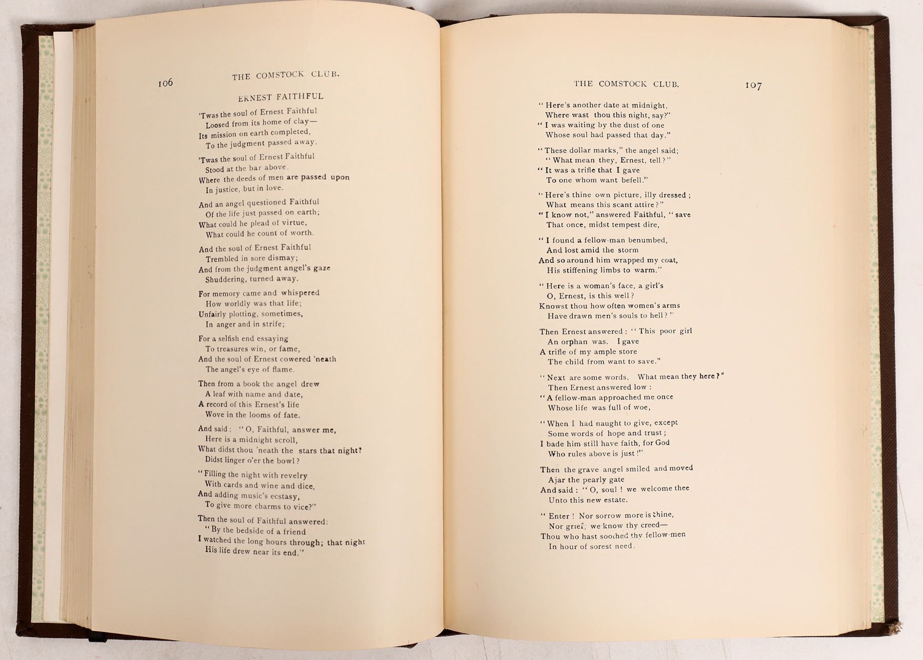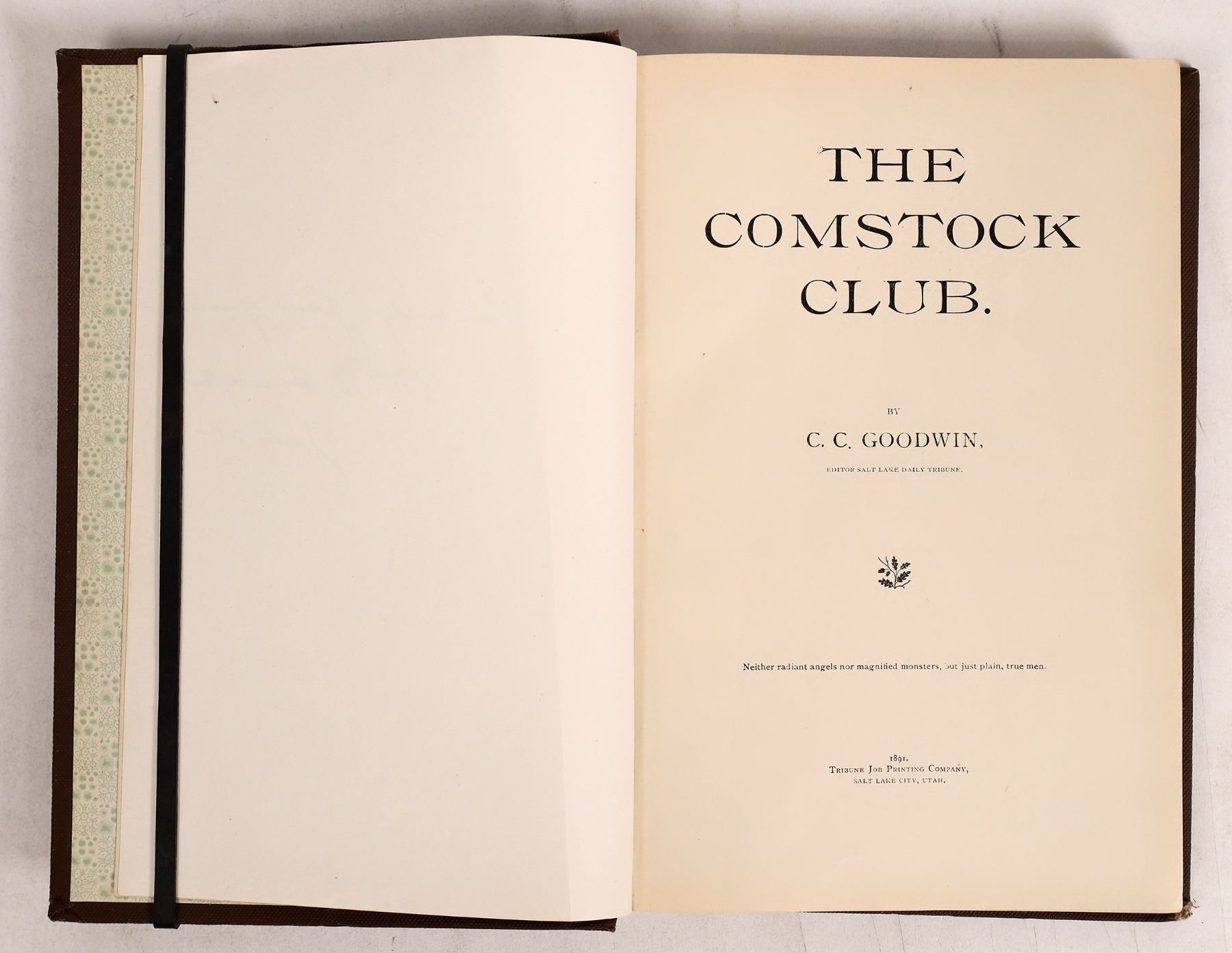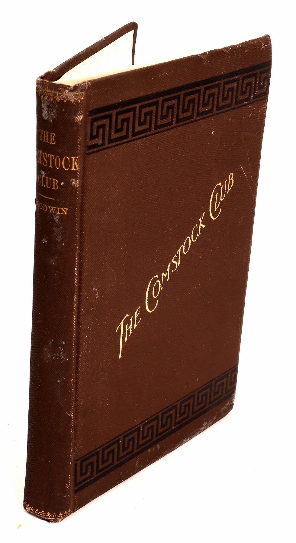 The Comstock Club by C C Goodwin. 1891 288pp. Members of the Comstock Club, all miners, spent evenings telling stories and anecdotes of mining adventures in California and Nevada, 1850's - 1860's. Inscribed "Sincerely your friend/W B Smedley/July 28-94." Extremities slightly rubbed, white abraded area on edge of front cover. Dinged corners, please inspect.