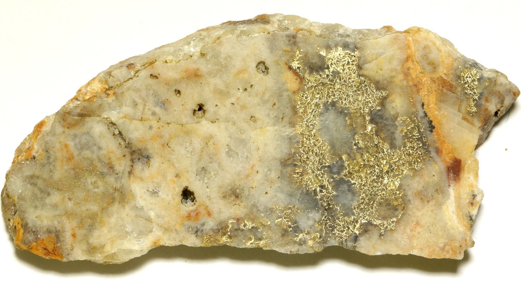 10.5 grams, 2.25 x 0.75" cut slab of high grade gold in quartz. X-Graeber (label). "Comstock Lode District". One of the best Comstock gold specimens we've seen.