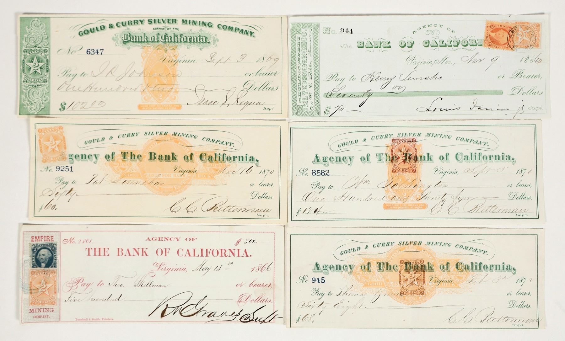 Lot of 6 different. Includes: 1866 Empire Mill & Mining Co. with NV orange adhesive and US IR stamps; Gould & Curry 1870 with RN-C and orange NV adhesive; 1866 G&C with orange NV adhesive and US IR stamps; 1872 G&C with rare RN-C21b; 1870 G&C with rare RN-B17b; and 1869 G&C with RN-B and green printed NV stamp. Nice revenue cross-section!