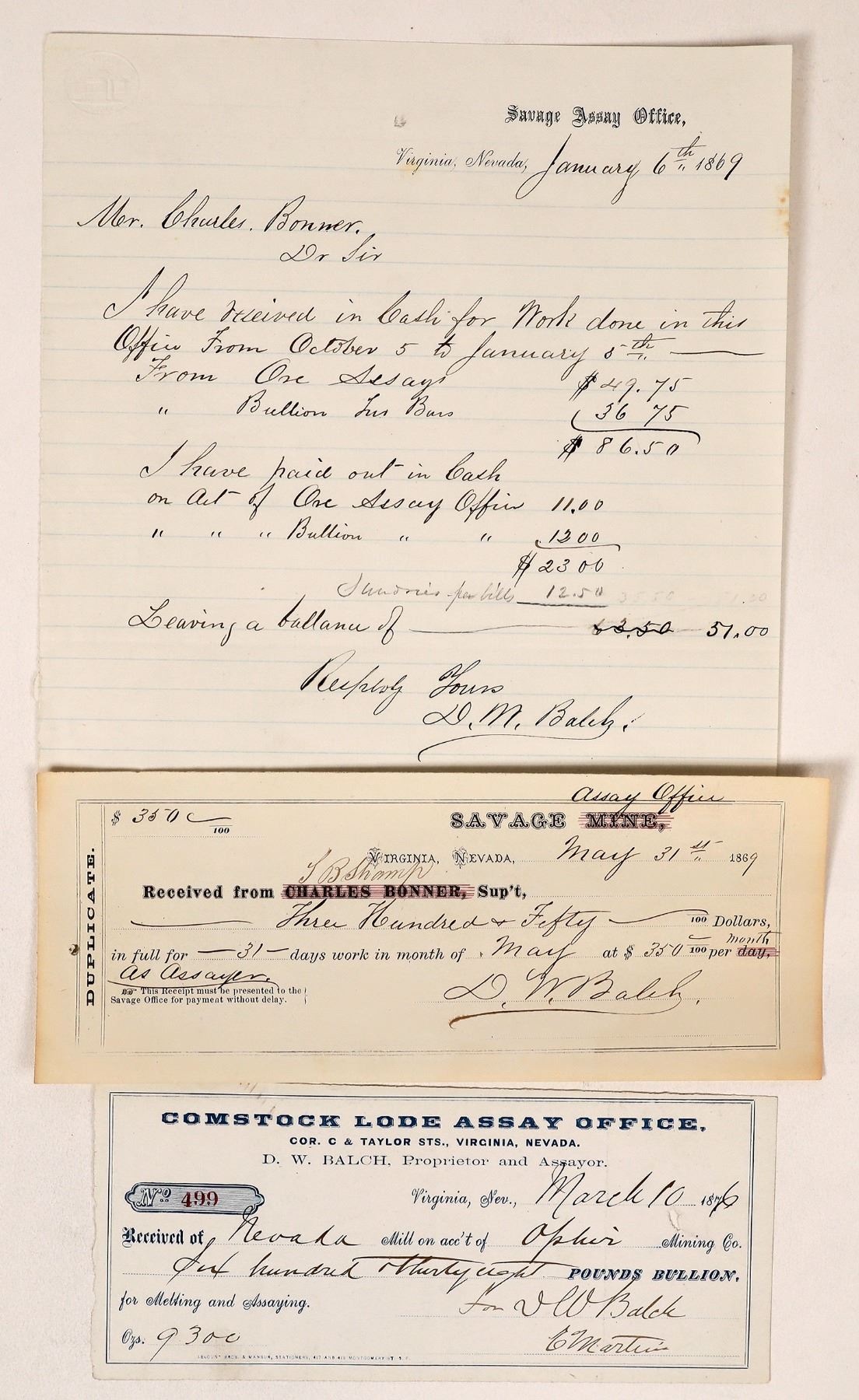 Lot of 3. 1) Check-sized receipt for the Comstock Lode Assay Office, DW Balch Proprietor and Assayer. Virginia, Nev., March 10th, 1876. Deposit of 9,300 ounces of bullion from the Nevada Mill on account of the Ophir Mining Company. Signed for Balch by C. Martin. Blue print, Lecount Bros. & Mansur, SF. 3.25 x 7.25" 2-3) Two items from Balch's time working for the Savage Mine. a) 1869 paystub from TB Shamp for 31 days work as assayer ($350). Signed by Balch. b) Savage Assay Office letterhead, 1869, addressed to Charles Bonner from Balch. Mentions charges for assays and bullion bars. Both signed by Balch. D.W. Balch previously worked for the Gould & Curry Mill, as well as the Savage Assay Office in the 1860s. He also very briefly served as the assayer for the Carson City Mint in 1869. He took over this assay office in 1872. Balch was present at the infamous Nevada & Oregon Railway meeting in Reno in 1881 where opposing parties of stockholders got into a disagreement that ended with gunfire. Balch was among those shot and injured (the bullet went through his wrist and into his lungs). He survived. The Nevada Mill was located on Mill Street in Virginia City and was built in the early 1860s. It was first owned by the Empire Mining Co., then worked Chollar-Potosi ore in the early 1870s. [Ansari] Virginia City Nevada Franklin Collection