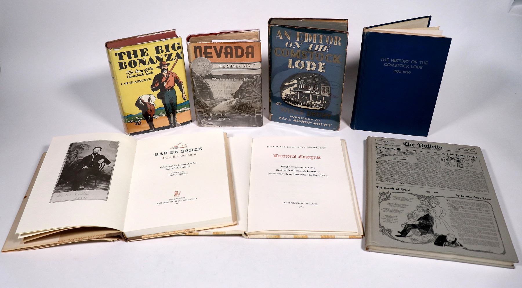 Lot of 7 different. Great little reference library for the Comstock or Nevada mining historian. Includes: An Editor on the Comstock Lode (Wells Drury, hardcover, 1936, toning/foxing); The Life and Times of the Virginia City Territorial Enterprise (Lewis Osborne, hardcover, 1971, limited 134/500, excellent condition); Dan De Quille of the Big Bonanza (James J. Rawls, 1980, hardcover, limited 650 copies, great condition); The History of the Comstock Lode 1850-1920 (Grant H. Smith, hardcover, 1943, great condition); The Big Bonanza (CB Glasscock, hardcover, 1931, very good condition); A Kid on the Comstock (John Taylor Waldorf, hardcover, 1968, with promotional material, great condition); and Nevada: A guide to the Silver State (Nevada Historical Society, 1940, hardcover with map, fair condition). Please inspect.