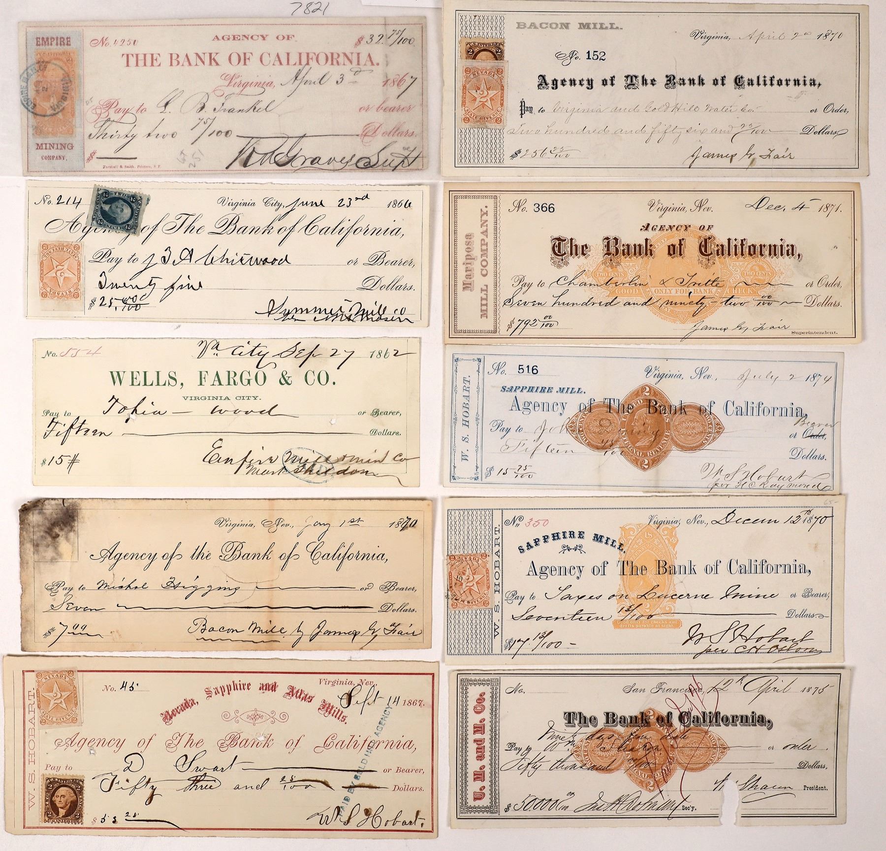 Lot of 10 different. Fantastic group! 1) Best is a Union Mill & Mining Company, Bank of California check issued to and signed by William Sharon for $50,000 (over $1 million today) in April 1875. Signature is partially torn off, as is seen in at least half of the current known pieces. Signed on the back by Sharon too (unaffected). There are only about a half dozen of these known! Red print, RN-D, San Francisco dateline. This check was issued at a critical time for the Bank of California. The Bonanza Firm had wrestled away control of the Comstock that the bank had established in the 1860s. Just 4 months after this check was issued, William Chapman Ralston would be dead, possibly by suicide. All other examples of this check known are also for huge sums of money issued to Sharon, clearly representing an internal reorganization of the company. The Union Mill & Mining Co. was the organization that managed the Bank of California's large number of Comstock mines and mills. (Fair, Flood, Mackay, & O'Brien later organized the Pacific Mill & Mining Co. to do the same for their properties). Sharon was one of the most powerful men on the Comstock, running the Bank of California for William Ralston. The bank made a fortune by loaning to mining companies and then seizing their properties when they defaulted. Sharon was instrumental in the creation of the Virginia and Truckee Railroad, which he wanted to connect the Comstock with the ore mills he owned along the Carson River (with Ralston). Later in life, he also served as a U.S. senator. 2-4) Three different Sapphire Mill / WS Hobart checks. Hobart was a key lumber and water industry figure. a) 1867 check signed by WS Hobart. (Nevada and Atlas crossed out). NV and US IR stamps. b) 1870 check with RN-B and NV adhesive revenue stamp. Issued for taxes on the Lucerne Mine. Signed for Hobart by Osborn. The Lucerne was in Silver City and became part of the Silver Hill group. c) 1874 check, RN-D, signed for Hobart by Raymond. 5) Mariposa Mill Company. 1871 check signed by mining millionaire and US Senator James G. Fair. RN-C. 6-7) Two different Bacon Mill checks. Both issued in 1870 and signed by Fair. One is manuscript and the other is a preprinted form (issued to Virginia & Gold Hill Water Co.). 8) Summit Mill check issued in 1866. Signed by Mason. NV and US IR stamps. 9-10) Two different Empire Mill & Mining Co. checks: one is very early (1862, territorial), signed by Sheldon; the other is 1867 and signed by RN Graves. Please inspect! Virginia City Nevada 1862-1875