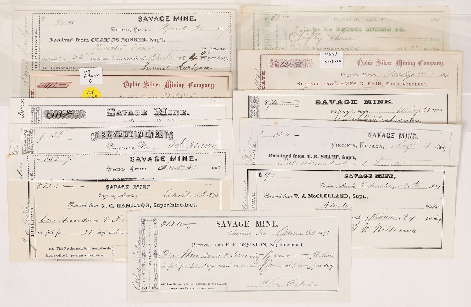 Lot of 12. Includes: Ophir Mining Co. (rare James G. Fair, 1878, and WH Patton, 1879); Potosi Mining Company (1889); and Savage Mining Co. (numerous supts. incl. ST Curtis, MG Gillette, AC Hamilton, JG Fair, TB Shamp, Chas. Bonner, TJ McClelland, and FF Osbiston, 1866-78). Please inspect. Virginia City Nevada 1866-89