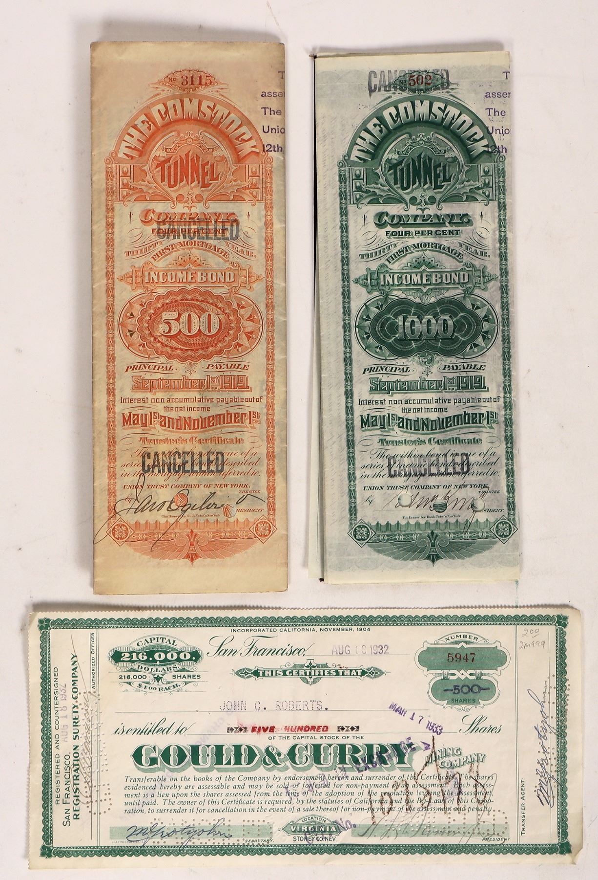 Issued 1933 Gould & Curry stock. 1889 Comstock Tunnel $500 and $1000 bonds. Virginia City Nevada