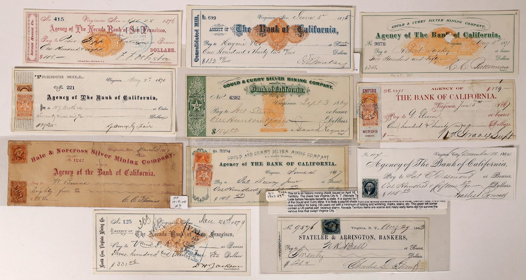 Lot of 11. All have different supt. signatures! All have RNs or adhesive revenue stamps. This is a handpicked group of checks that represent all the great mining supts. on the Comstock. 1) Stateler & Arrington territorial check issued to Ball in 1863, signed by Charles Strong (for the Gould & Curry). Strong was removed due to the excessive costs of the Sevenmile Canyon mill. 2) Dec. 1864 check issued to Desmond, signed by Charles Bonner (for Gould & Curry). Bonner was the namesake of the Bonner Shaft, an 1860s shaft for the G&C to explore lower depths. 3) Gould & Curry Silver MC, "dripping letters" form, 1867, signed by Louis Janin Jr. as supt. Janin was a prominent mining engineer who was educated at the Freiburg School of Mines. Before coming to the Comstock, he worked for the Enriquita Quicksilver Mine near San Jose, California. He began his work on the Comstock at the Mexican Mill and sought to increase silver extraction that was being lost in the slimes and tailings. Using a modified Freiberg barrel amalgamation process, he was successful in profitably re-working the tailings at the Gould & Curry Mill. He was put in charge of the Gould & Curry Mine in 1866, when it was struggling. 4) Hale & Norcross Silver MC, 1867, signed by CC Thomas. Very rare check. Thomas also served as the supt. for the Sutro Tunnel. 5) Empire Mill & Mining Co., 1867, signed by RN Graves. Graves was also president of the Bodie Railroad, which he co-founded with Henry Yerington and Seth & Daniel Cook. Like other Comstock millionaires, Graves made his fortune on the Comstock and then retired in San Francisco. 6) Gould & Curry SMC, RN-B and green NV stamp, 1869, signed by Isaac Requa. Requa was also superintendent of the Chollar Potosi, as well as president of the Central Pacific Railroad. 7) Trench Mill, 1870, signed by Bonanza King mining millionaire and US Senator James G. Fair. One of the four members of the ultra important Bonanza Firm. 8) Gould & Curry SMC, RN-C, 1871, signed by CC Batterman. Batterman was also superintendent of the Imperial SMC and Crown Point, among others. 9) Consolidated Mill, 1875, RN-D, issued to Haynie & Co. (VC lumber), signed by Bonanza King mining millionaire John Mackay, arguably the most respected supt. on the Comstock. 10) Savage Mining Co., RN-F, 1876, signed by Osbiston. He was the namesake of the Osbiston Shaft, owned by the Gould & Curry and Best & Belcher. 11) North Con. Virginia Mining Co., RN-G, 1879, issued to the Virginia & Truckee Railroad, signed by DH Jackson.