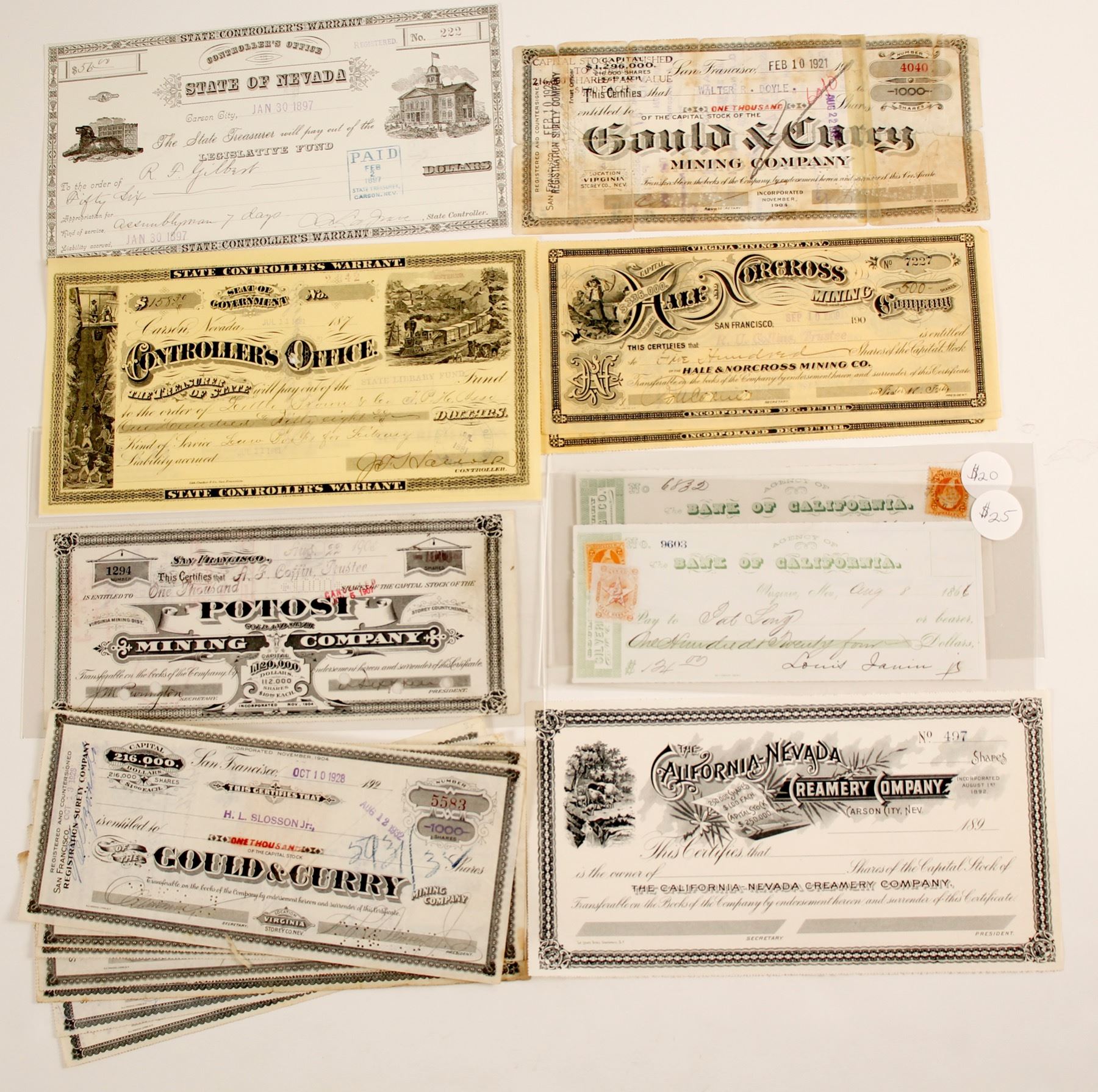 Approx 14 Comstock items. Gould and Curry stocks and checks, Hale and Norcross Mining stocks, State Controller's warrants, Potosi Gold and Silver mining stock 1906 in Pass-co EF holder. City: Virginia City State: Nevada Date: HWAC# 79339