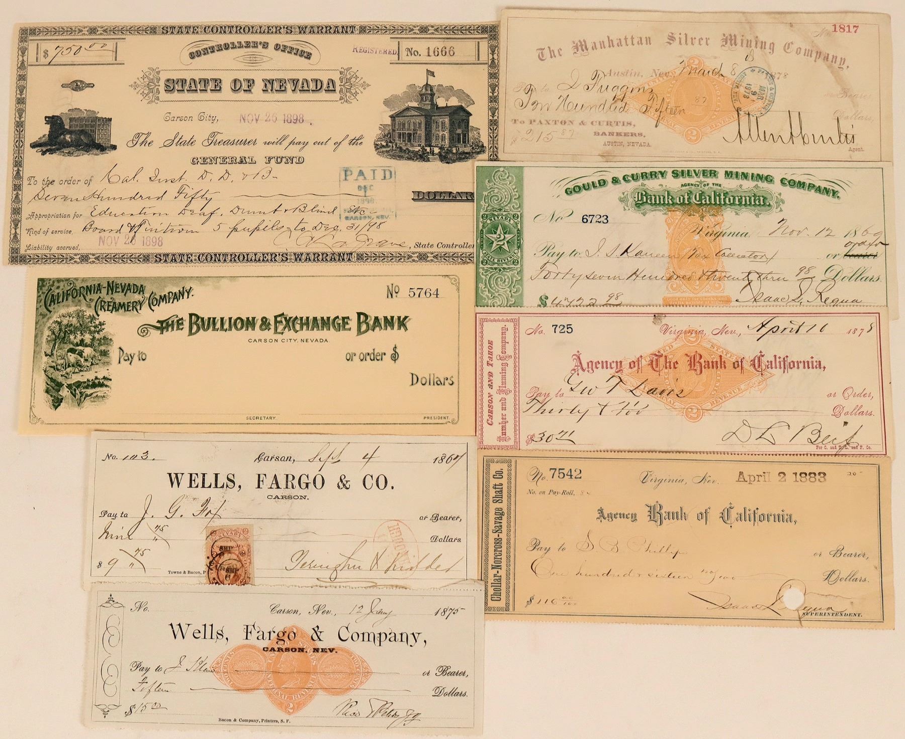Lot of 8 incl. revenue pieces. 1) Virginia City: Gould & Curry SMC, 1869, RN-B, signed by Isaac Requa; Carson & Tahoe Lumber & Fluming Co., 1878, RN-G, signed by DL Bliss; and Chollar-Norcross-Savage Shaft Co., 1883, signed by Requa. 2) Carson City: California-Nevada Creamery Company (unused, pictorial); Wells, Fargo & Co, 1867, signed by Yerington & Kidder, NV and US IR adhesive stamps; Wells, Fargo & Co., 1875, RN-D; and pictorial Controller's Office Warrant, 1898. 3) Other: Manhattan Silver Mining Co., Austin, 1878, RN-G, signed by Curtis.