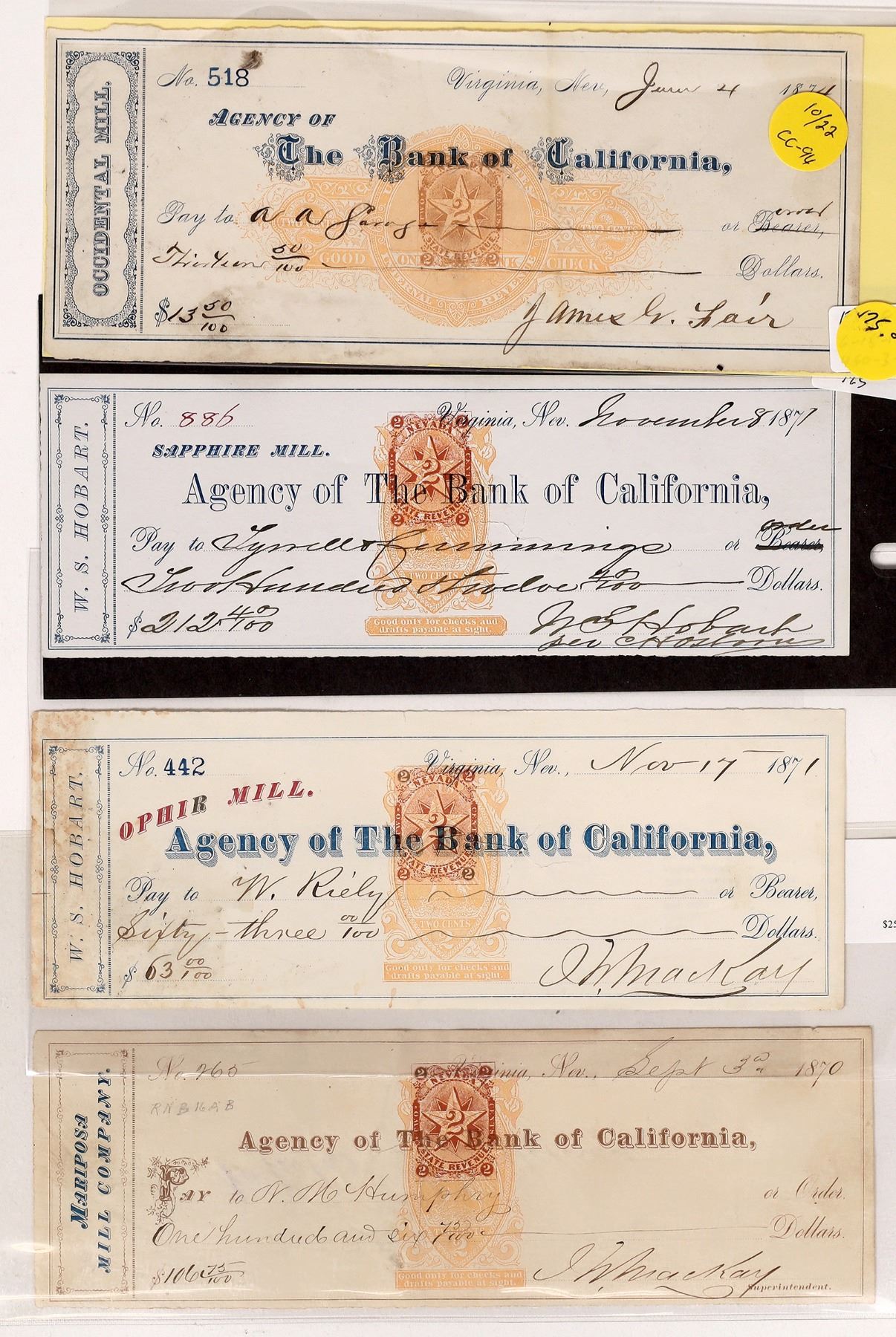 Lot of 4. 1) Mariposa Mill Company. Very rare RN-B16a imprinted revenue. Issued in 1870 to NN Humphrey. Signed by "Bonanza King" mining millionaire John Mackay. Tape repaired spindle cancel, toning/soiling. The Mariposa Mill was located at the head of Sevenmile Canyon, south of the Sierra Nevada Mine, and north of Virginia City. Kelley reports on it in 1862. By 1867, the Bank of California/William Sharon ring owned it and it was called the California Mill. In 1871-72, it was again known as the Mariposa Mill and was processing ore from the Hale & Norcross. [Ref: Ansari] 2) Ophir Mill / WS Hobart, Bank of California. RN-B16a. Issued in 1871 to Riley. Signed by Mackay. Some soiling on left border. This Ophir Mill was sometimes referred to as the New Ophir Mill to distinguish it from the 1860s mill located in Washoe Valley. This later Ophir Mill was located on the Carson River. It was owned by the Ophir Mining Company. In the 1860s, it was processing Yellow Jacket ore. In 1868, the New Ophir Mill was owned by William Sharon and the Bank of California. From 1872-83, it was owned by Mackay and Fair and processed tailings. [Ref: Ansari] 3) Sapphire Mill / WS Hobart, Bank of California. RN-B16a. Issued in 1871 to Tyrell & Cummings (owners of Union Iron Works). Signed for Hobart by Raymond. Clean. The Sapphire Mill was built in the early 1860s and was located 1/4 mile below Gold Hill. It was originally known as JB Gagnon & Co.'s Mill. In the 1870s, it had 15 stamps and a 40-ton daily capacity and was processing ore from the Crown Point Mine. It was one of a few mills owned by WS Hobart. 4) Occidental Mill, Bank of California. Issued to AA Savage (who owned a hauling business in VC) in 1874. Signed by Bonanza King mining millionaire and US Senator James G. Fair. RN-C21b. The Occidental Mill was built near the Occidental Mine at Gold Hill in 1870. It had 20 stamps and a 50-ton capacity. Virginia City Nevada 1870-74
