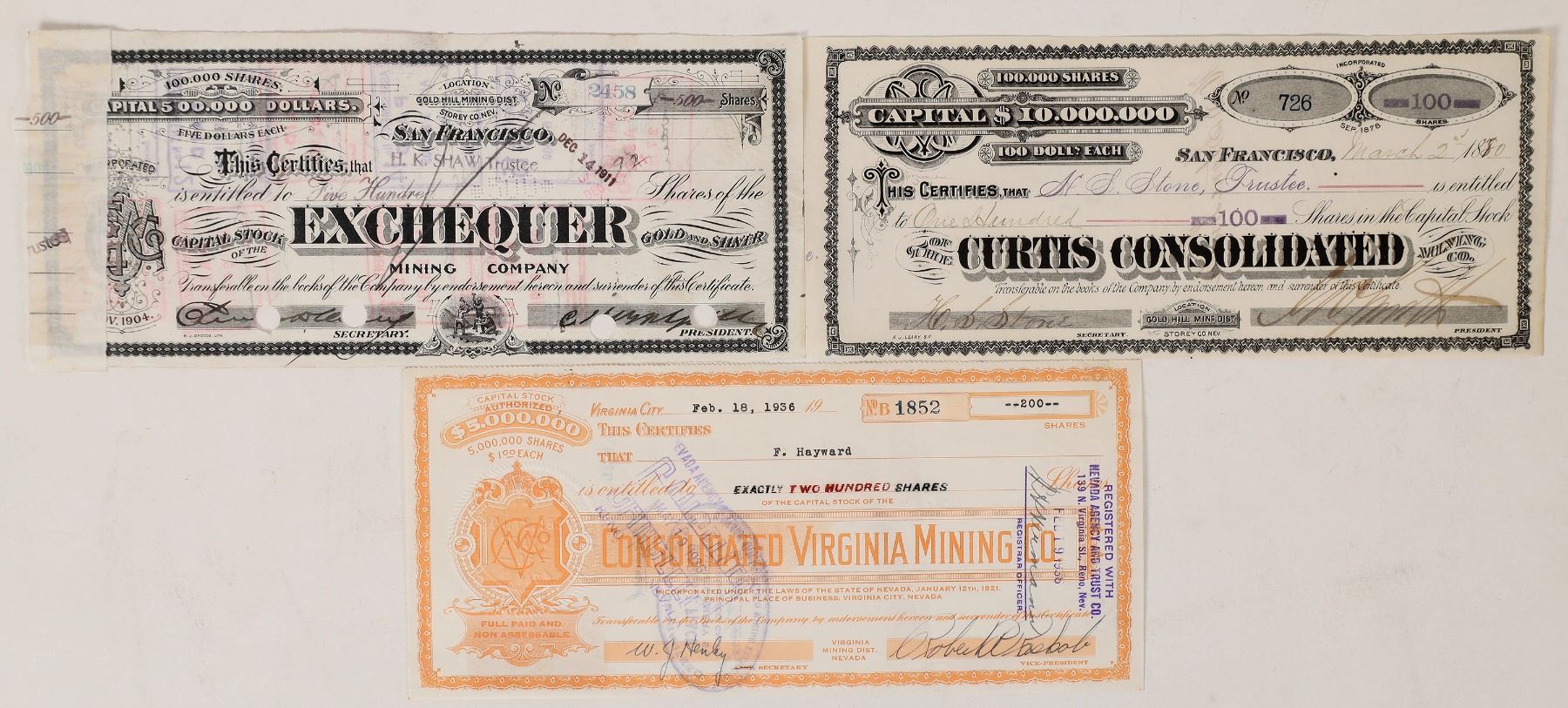 Three stock certificates from the Comstock Lode: 1) 1880 Curtis Consolidated one hundred shares issued to H. S. Stone; Gold Hill Mining District of Storey County; 2) 1911 Exchequer Gold and Silver Mining Company 500 shares issued to H K. Shaw, Gold Hill Mining District. 3) 1936Consolidated Virginia Mining Co.,200 shares issued to F. Hayward, Virginia Mining District, stock transfer stamps on reverse. Nevada