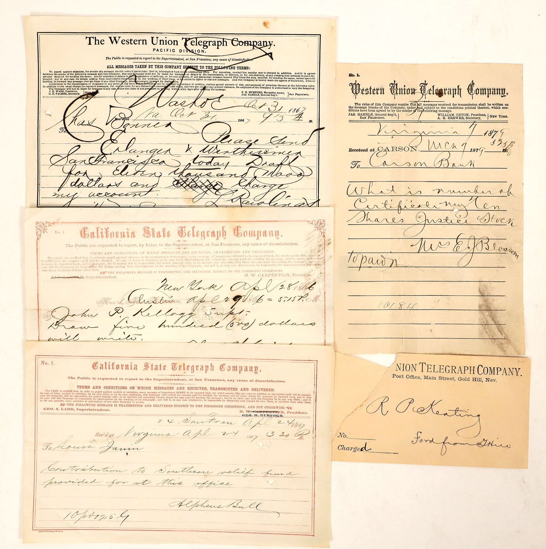 1867 California State Telegraph signed by Alpheus Bull who president of Gould and Curry Mine in Virginia City and was a Comstock millionaire. Also, 1867 Western Union Telegraph from Washoe and 1879 Western Union Telegraph from Virginia to Carson-tape repair on verso and a few small holes.