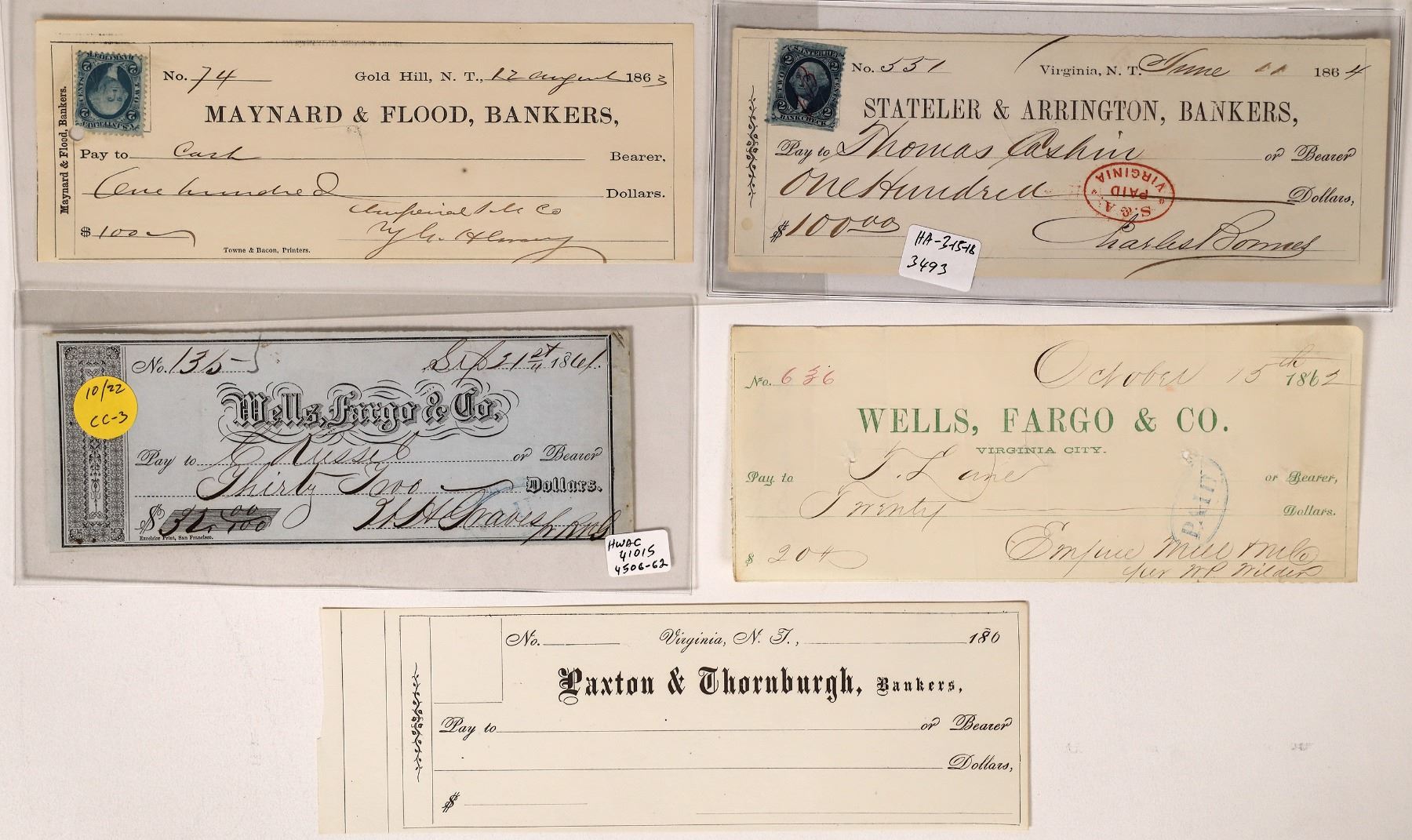 Lot of 5 different. Nevada became a territory in March 1861 and became a state on Oct. 31st, 1864. 1) Very early Sept. 1861 blue Wells Fargo & Co. issued to C. Russel. Signed by RN Graves as supt. for the Empire Mill & Mining Company. These blue checks are the earliest Nevada checks. 2) Green print Wells Fargo & Co. with printed Virginia City designation. Issued in Oct. 1862 to T. Lane. Signed for the Empire Mill & MC by Wilder. 3) Maynard & Flood, Gold Hill, 1863, issued by the Imperial Silver Mining Co. 4) Stateler & Arrington, Virginia City, 1864, issued to Thomas Cashin. Signed by Charles Bonner (for the Gould & Curry). Bold red cancel. 5) Paxton & Thornburgh, unissued, Virginia City, NT dateline.