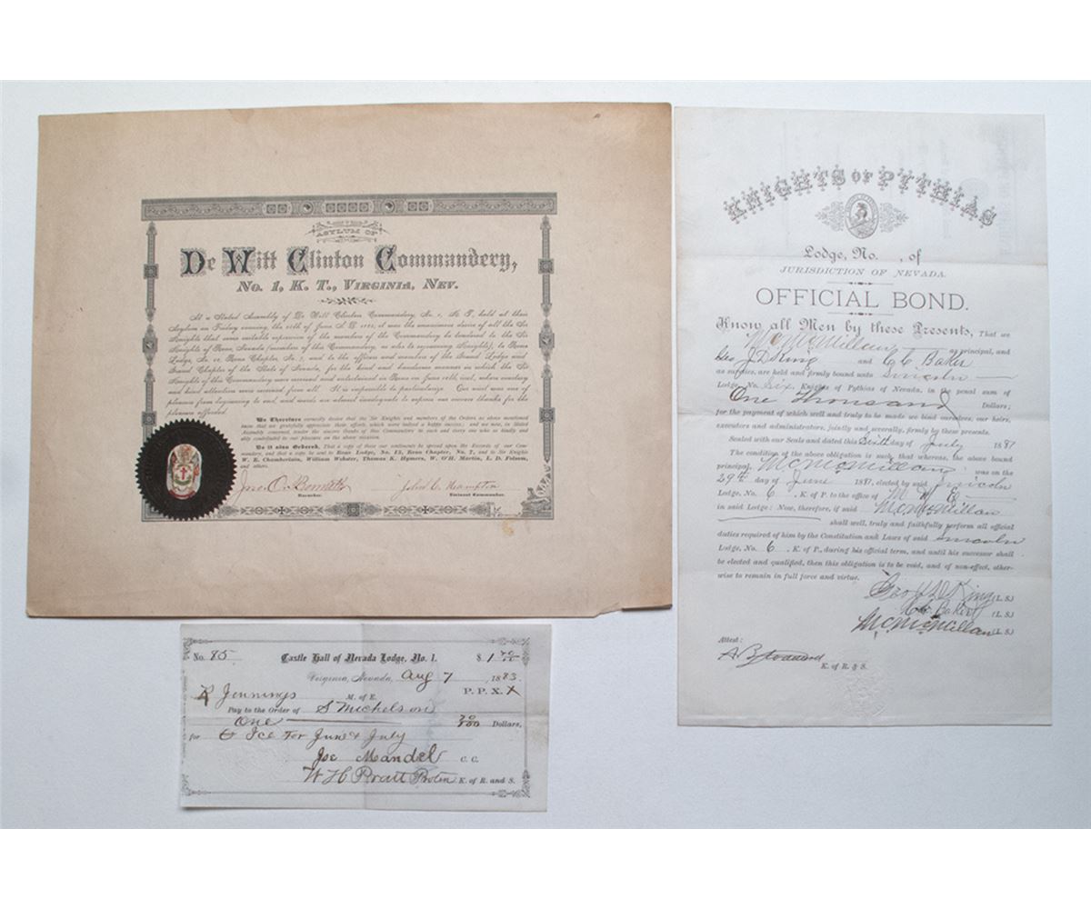 Lot of 3. 1) Castle Hall of Nevada, Lodge No.1. Pay to the order of S Michelson for ice for June and July. 2) Knights of Pythias Lincoln Lodge #6 Official Bond. Signed by George King, CC Baker, M McWilliams. 3) Asylum of De Witt Clinton Commander No. 1. Signed by John Bennett and John Hampton.