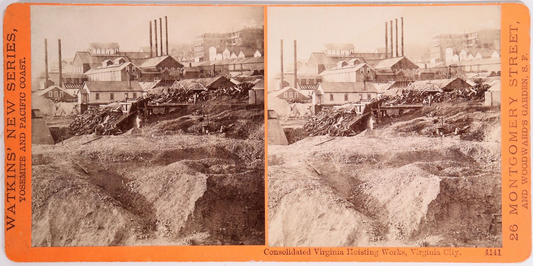 Consolidated Virginia Hoisting Works, Virginia City Stereoview. Pacific Coast Views, C.E. Watkins, San Francisco. c.1876-79. "Consolidated Virginia Hoisting Works, Virginia City. 4141." Great view looking up towards the town (International Hotel in view) with large stacks of lumber in front. Medium contrast, sharp focus. This was the largest producing mine on the Comstock, the site of the Big Bonanza ore discovery in 1873. Located between the California and Best & Belcher Mines. The Bonanza firm quietly bought up its stock in the early 1870s (like they did with the Hale & Norcross) and their gamble paid off big with the Bonanza discovery. The Con. Virginia produced 809,000 tons, and tens of millions of dollars in gold and silver. Virginia City Nevada Franklin Collection