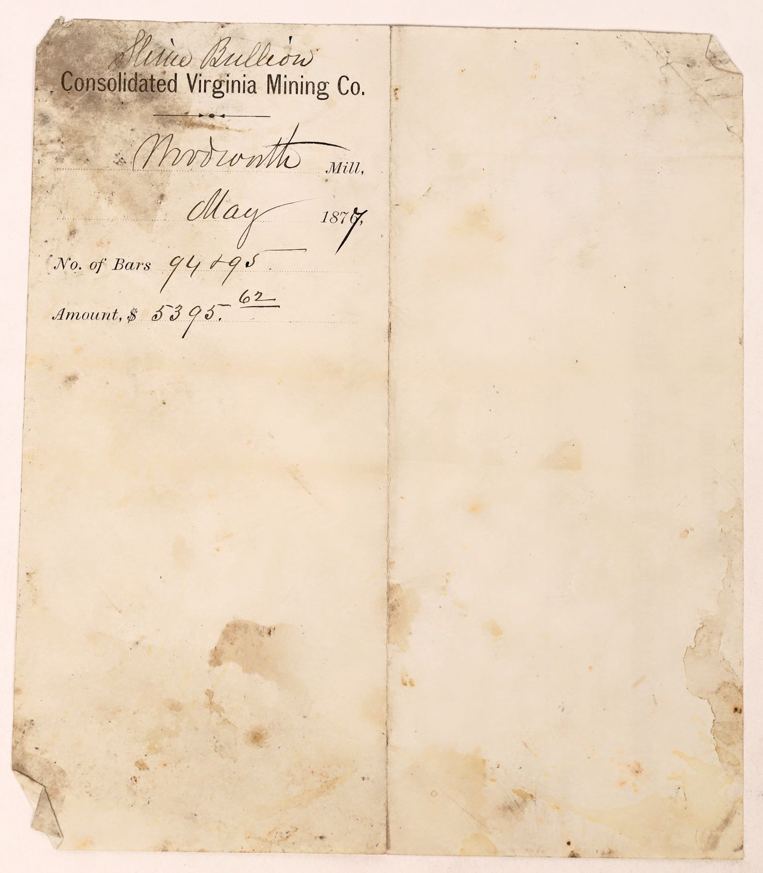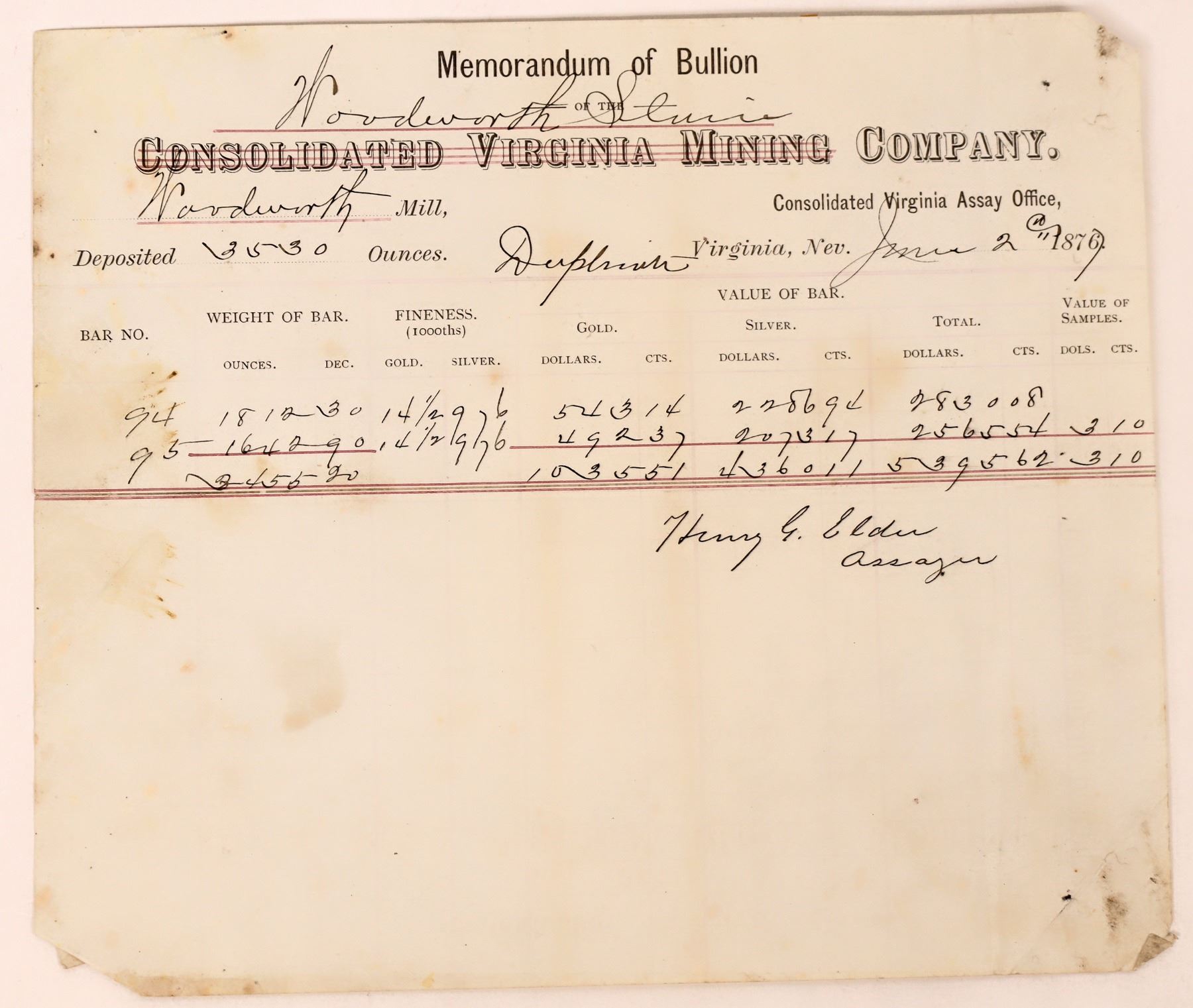 Memorandum of Bullion for the Woodworth Sluice ("Consolidated Virginia Mining" crossed out). Consolidated Virginia Assay Office, Virginia, Nev. June 2nd, 1877. Two bars of sluice bullion for the Woodworth Mill, 1800 and 1600 ounces, .976 fineness in silver. Valued at $5,395.62. Signed by assayer Henry G. Elder. 8 x 7" Soiling. The Woodworth Mill was located on the Carson River about one mile above Dayton. In the early 1870s, it had 24 stamps and a 48-ton capacity. Rare sluice assay. Virginia City Nevada Franklin Collection