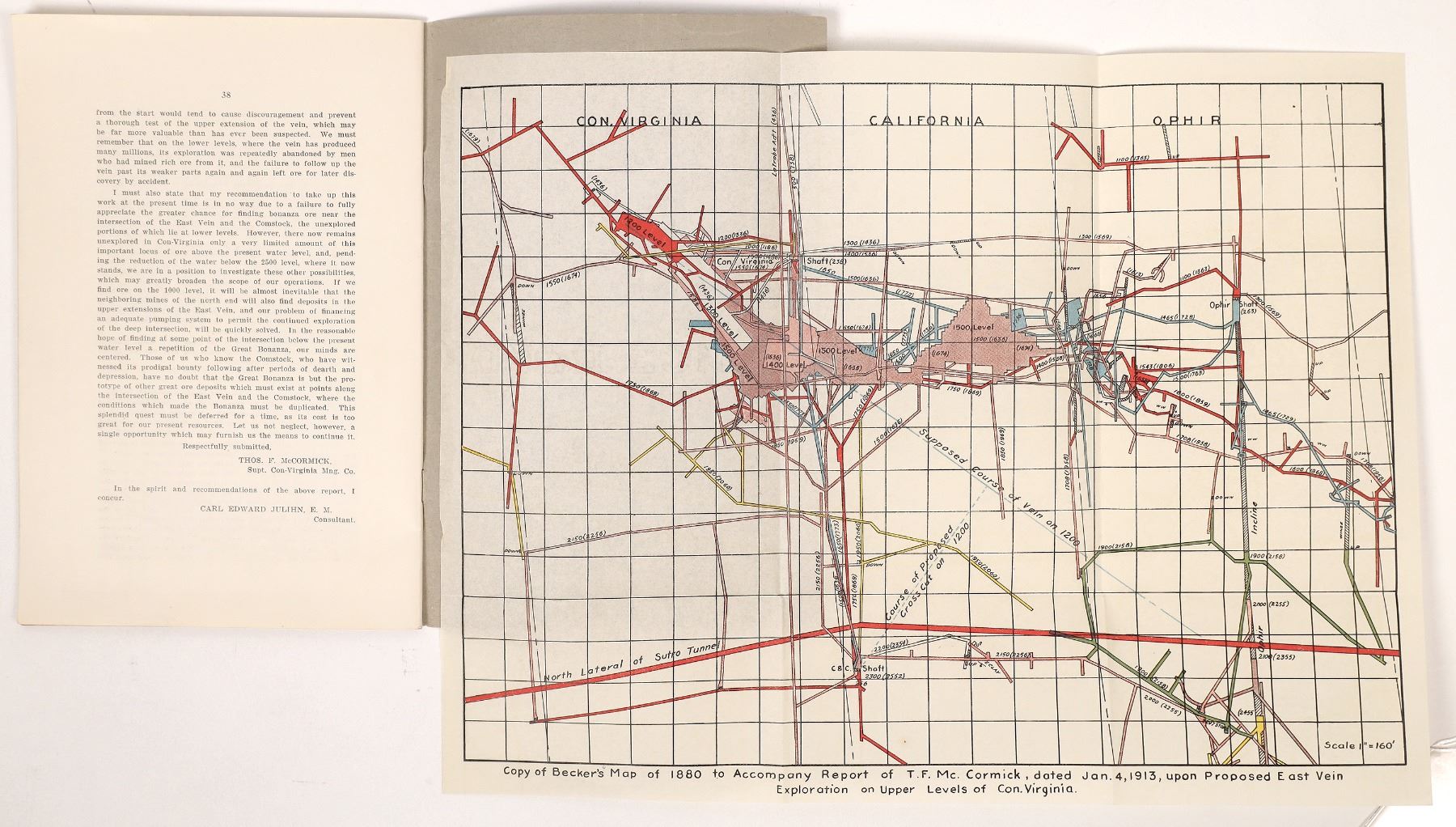 Lot of 2 different for this famous mine owned by the Bonanza Kings and the site of the Big Bonanza discovery. 1) Report Upon Proposed Exploration on the Upper Levels of Con-Virginia. 1913. Extremely rare and important. 38pp. with fabulous color map detailing shafts, drifts and stopes of paying ore. Includes a history of the mining development at each level for both Bonanza Mines (the Con-Virginia and the Consolidated California) from 1873 Ò 1881. Table of Operations, Production and Dividends for the same period. 9 x 6" Map is 11 x 14" 2) Annual Report of the Consolidated Virginia Mining Company, 1880. 24pp. No Bonanza Kings are listed as officers for the company. Reporting on bullion shipments, expenses, balance sheet, cash flow, etc. along with PresidentÌs report. Paper cover. 9 x 5.5" Virginia City Nevada 1880-1913