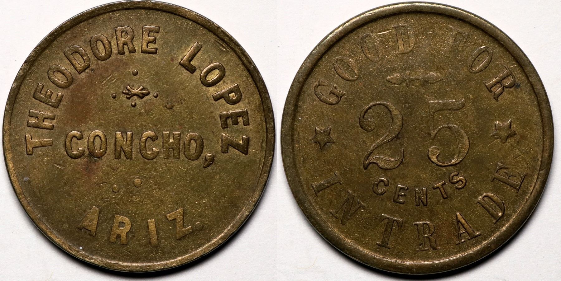 Theodore Lopez / Concho, / Ariz. // Good For / 25c / In Trade. Brass, 25mm, R8.