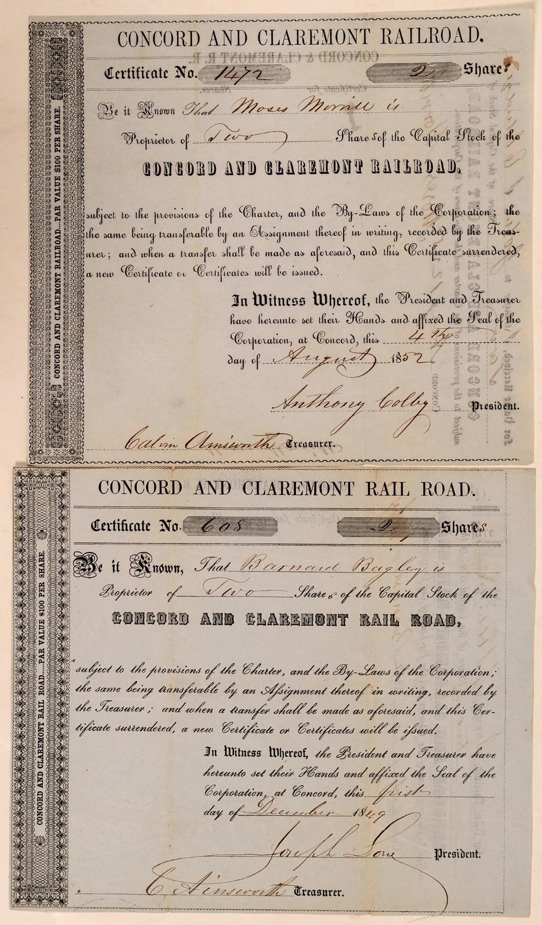 Two issued certificates. Cert. #605, issued for 2 shares in 1849 to Barnard Bayley and signed by Joseph Lowe as president. Black on blue, odd shares. No vignette. Also, cert. #1472, issued for 2 shares to Moses Merril and signed by Anthony Colby as president. Both are uncancelled.