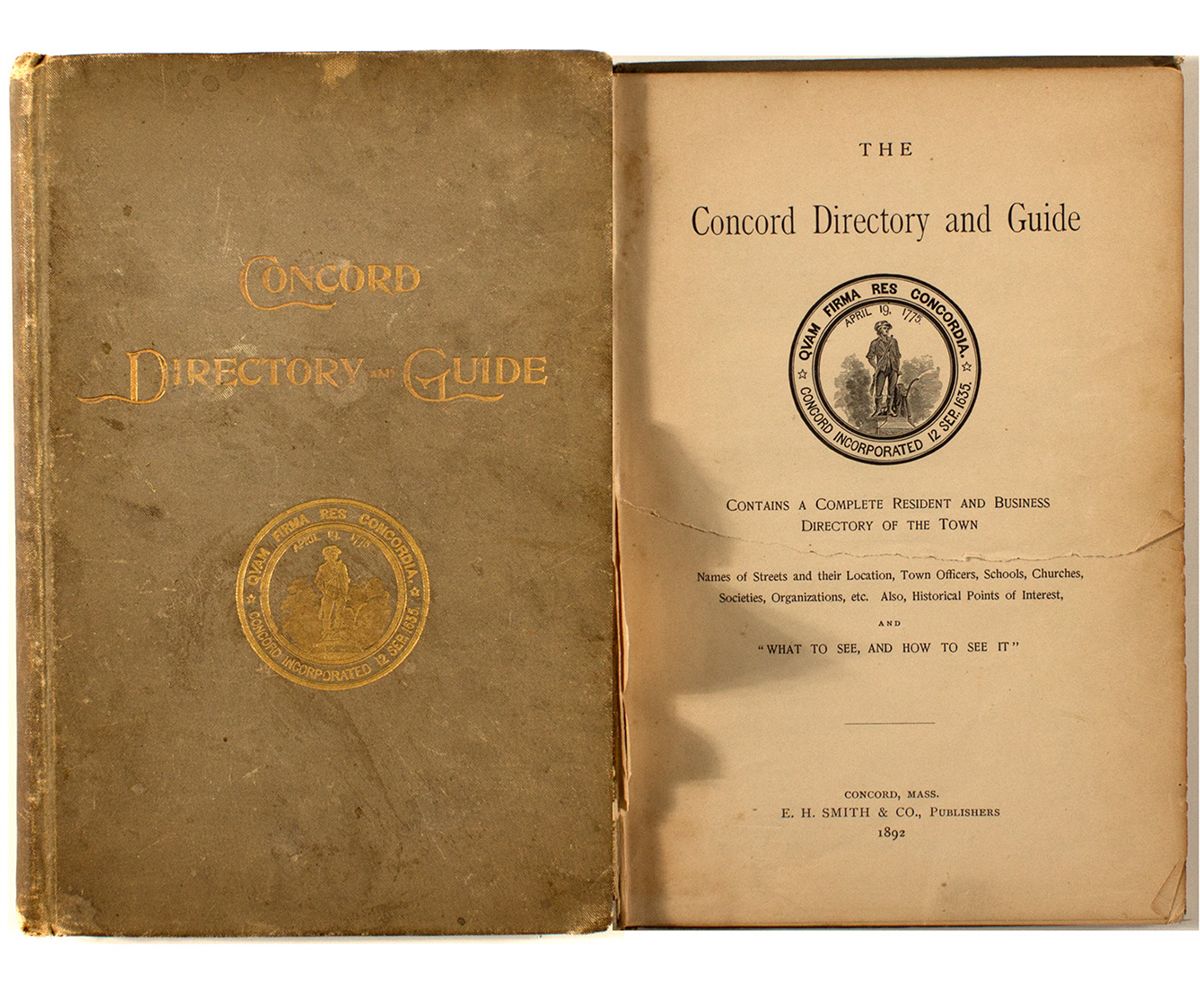 “contains a complete resident and business directory of the town, names of streets and their location, town officers, schools, churches, societies, organizations, etc. ; also, historical points of interest, and What to see, and how to see it". E. H. Smith & Co., publishers. Lists ponds, rivers, railroad stations, occupations, water works, lodges and a TOURISTS GUIDE. Be sure to visit Mrs. Ralph Waldo Emerson while you are checking out the town. She lives on the Cambridge Turnpike. She would pass away shortly after this directory was distributed. Gray cloth cover. Pages 1/2 and 3/4 ripped in half, but intact. Spine cover coming loose and inside front cover wearing and splitting from pages. No map. 165 pages. [Rarity: iii]City: ConcordCounty: State: MADate: 1892